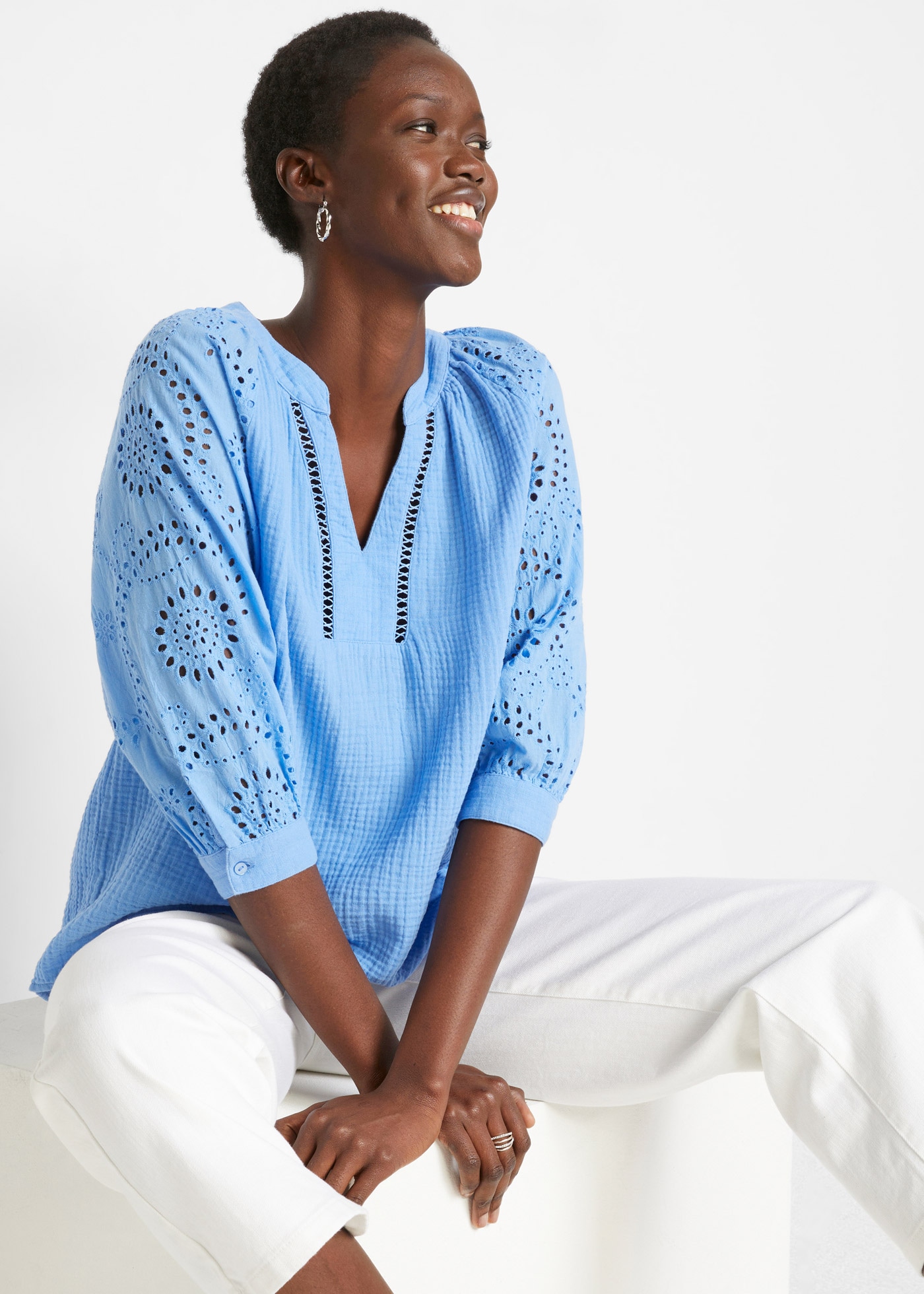 - Spitzen-Looks für den Alltag: Baumwoll-Tuniken mit Häkelspitze stellen sich als charmante Begleiter zu Jeans vor. Sie setzen mit ihrem zarten Design einen spannenden Kontrapunkt zu robustem Denim.