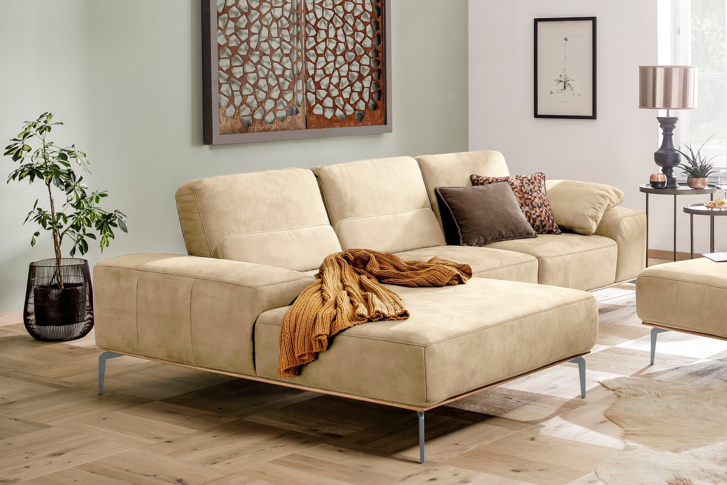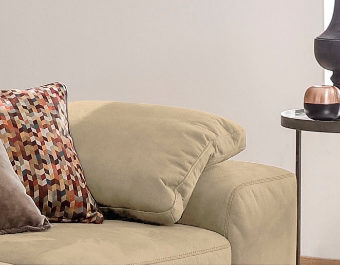 Wissenswertes | Flexible Sitztiefe: Bei den Sofas kann der gesamte Rücken pro Sitz um einige Zentimeter nach hinten versetzt werden, um eine Vergrößerung der Sitztiefe zu erzielen. Die Gesamttiefe ändert sich.;Der Sockel in Echtholz Eiche integriert sich wunderbar ins Design Ihres Möbelstücks;Polsteraufbau: