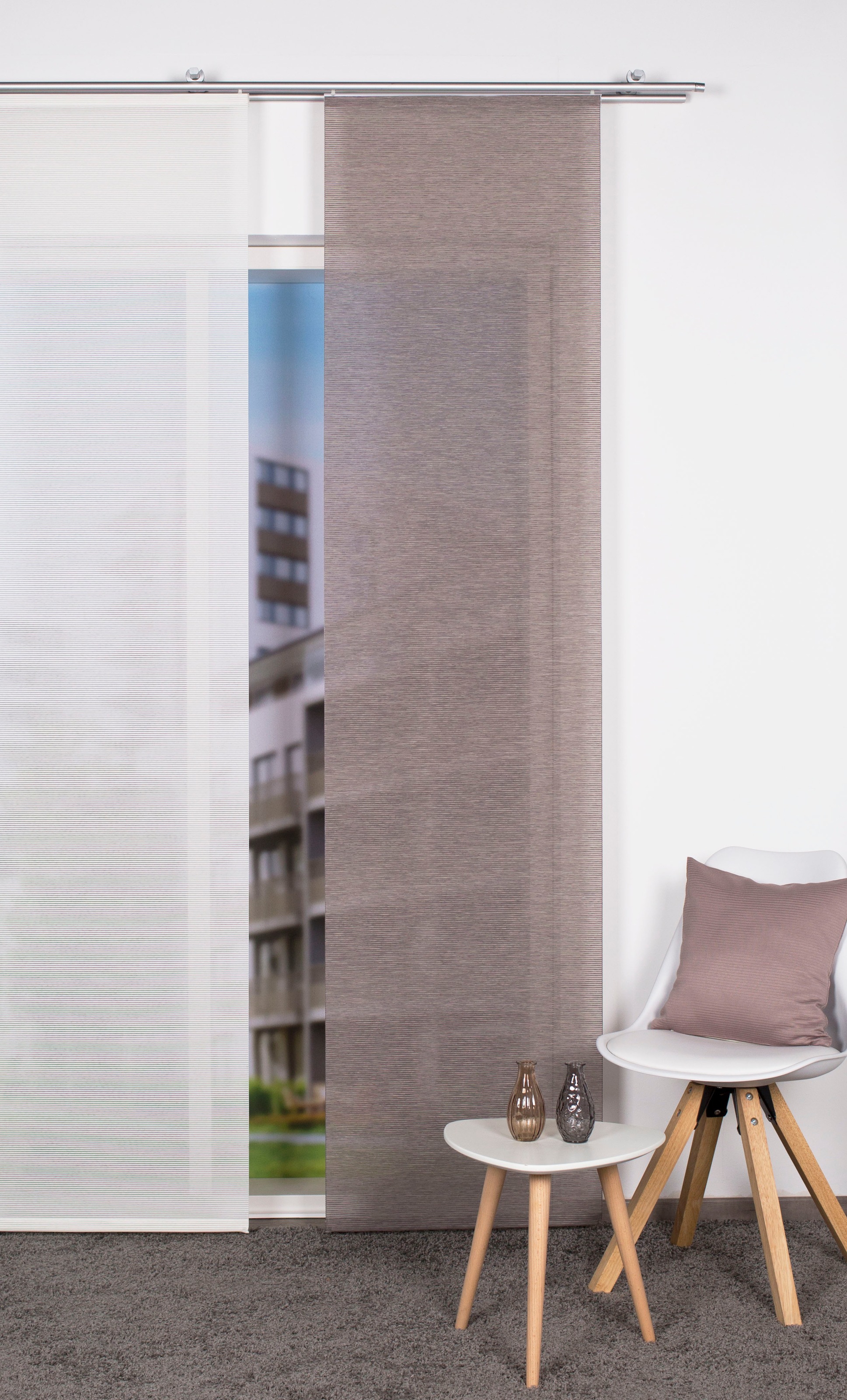 Hinweis Dekoration | Eine Schiebegardine ist eine schmale, glatt hängende Stoffbahn, die sich sowohl als Sichtschutz als auch zur Raumteilung eignet. Durch die Schiebetechnik sind Schiebegardinen sehr flexibel einsetzbar. |