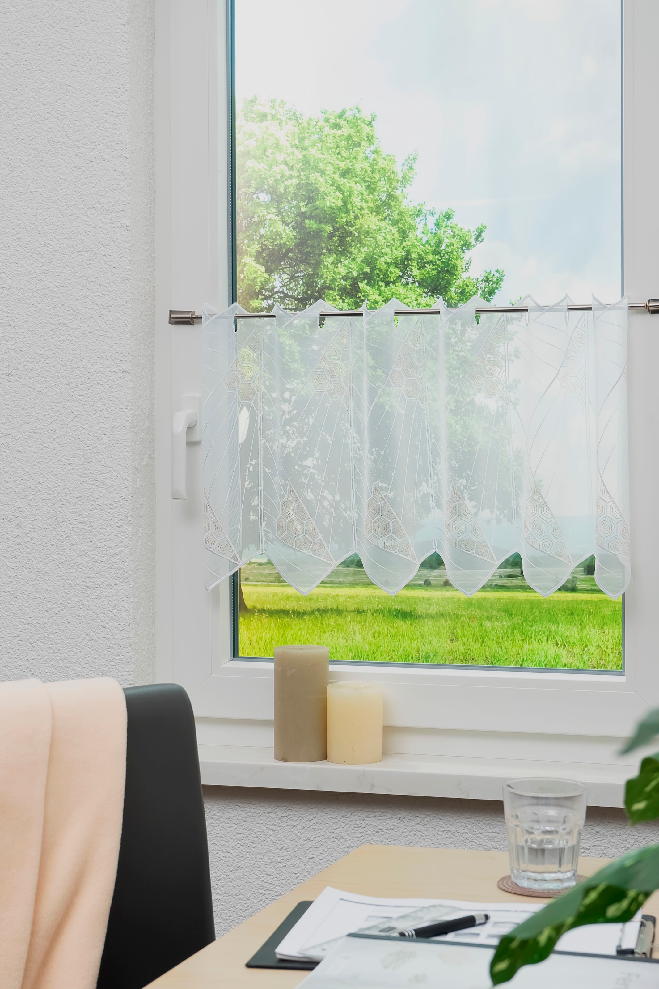 Dieser ansprechende Fensterbehang »Linda« aus dem Hause Stickereien und Textilien Plauen sieht in jeder Ausführung sehr schön aus. Echte Plauener Stickerei, gesickt auf einem Transparentem Voile sorgt für ausreichend Lichteinfall. Es gewährt den gewünschten Einblick oder Ausblick und erfreut den Betrachter mit ihrem schönen Design. Das pflegeleichte Material ist in der Maschine waschbar. Mit dem leichten Glanz des Polyestergarnes wird ein stilvolles Ambiente an Ihrem Fenster geschaffen.