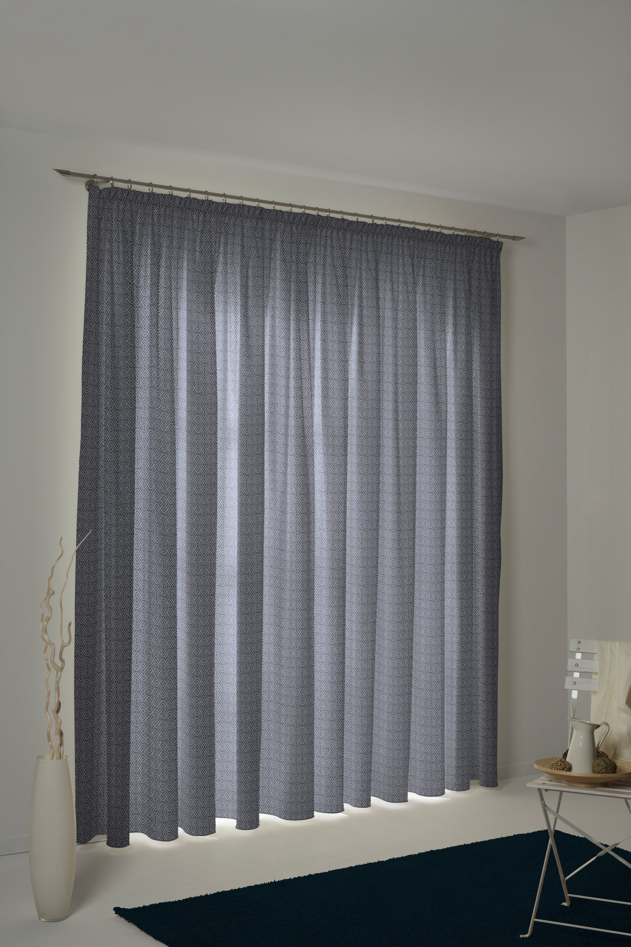 - Aufhängung: Mit Kräuselband für gleichmäßige Faltenlegung und flexible Anbringung