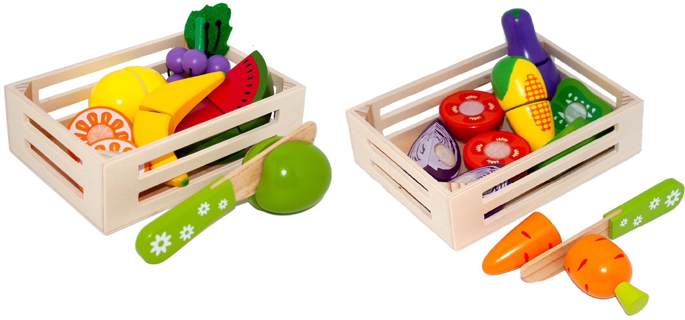 Lieferumfang | diverse Obstsorten;diverse Gemüsesorten;2 Holzsteigen;2 Holzmesser |