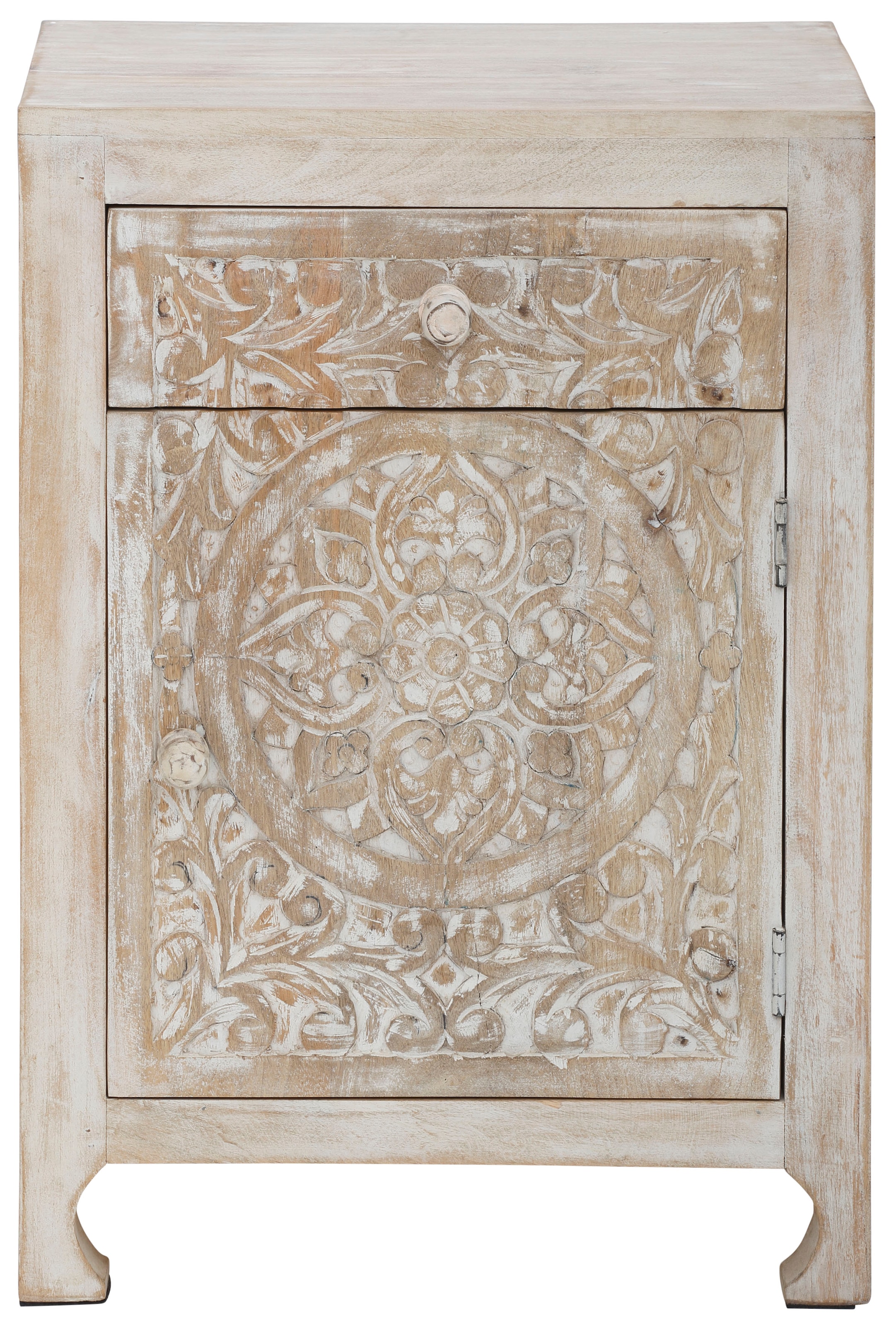 Home affaire Nachtkommode »Bonstetten« pflegeleichtes Mangoholz, mit dekorativen Schnitzereien, Breite 50 cm