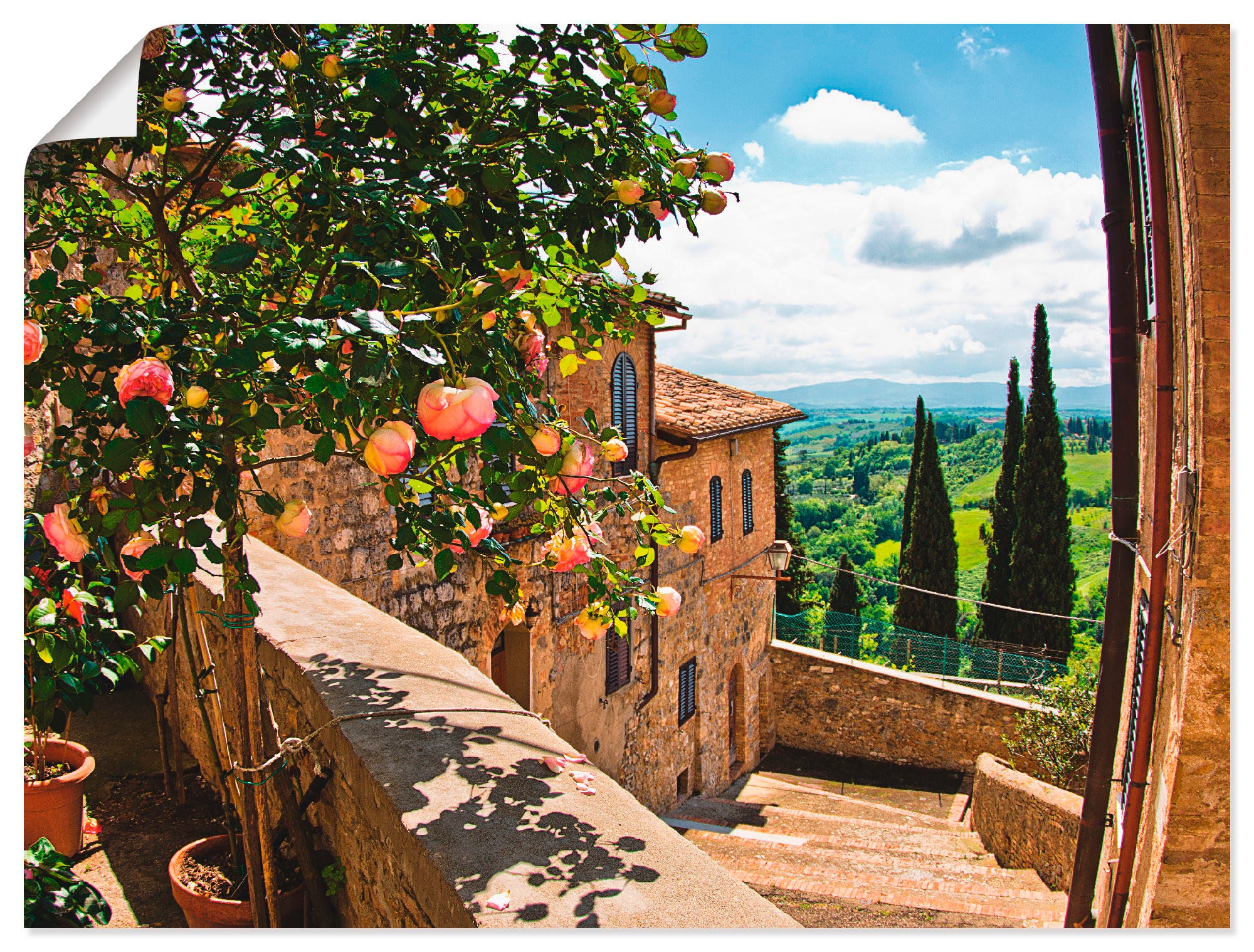 Artland Wandbild »Rosen auf Balkon Toskanalandschaft« Garten 1 Stk. tlg. als Alubild, Outdoorbild, Leinwandbild, Poster, Wandaufkleber