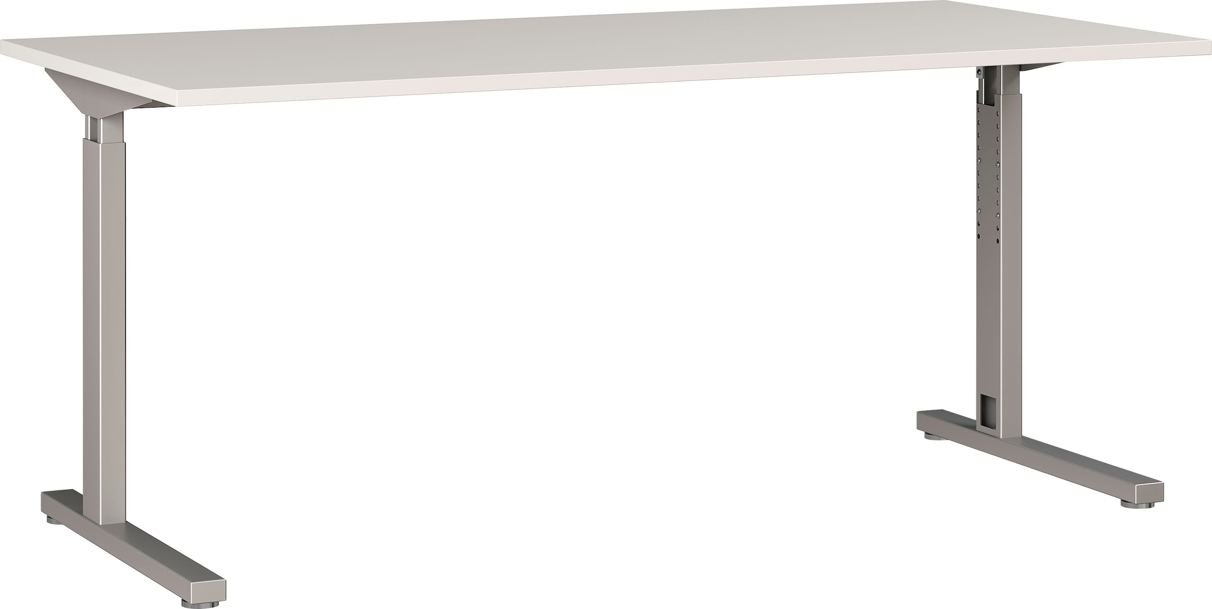 Mechanisch höheneinstellbarer Schreibtisch mit zwei C-Füßen; Tischplatte (belastbar bis zu 80 kg), Gestell aus pulverbeschichtetem Metall in Silber; Höhe einstellbar von 70-80 cm; Nivellierbare Gleiter, Melaminharzbeschichtung, ABS-Kanten; Made in Germany.