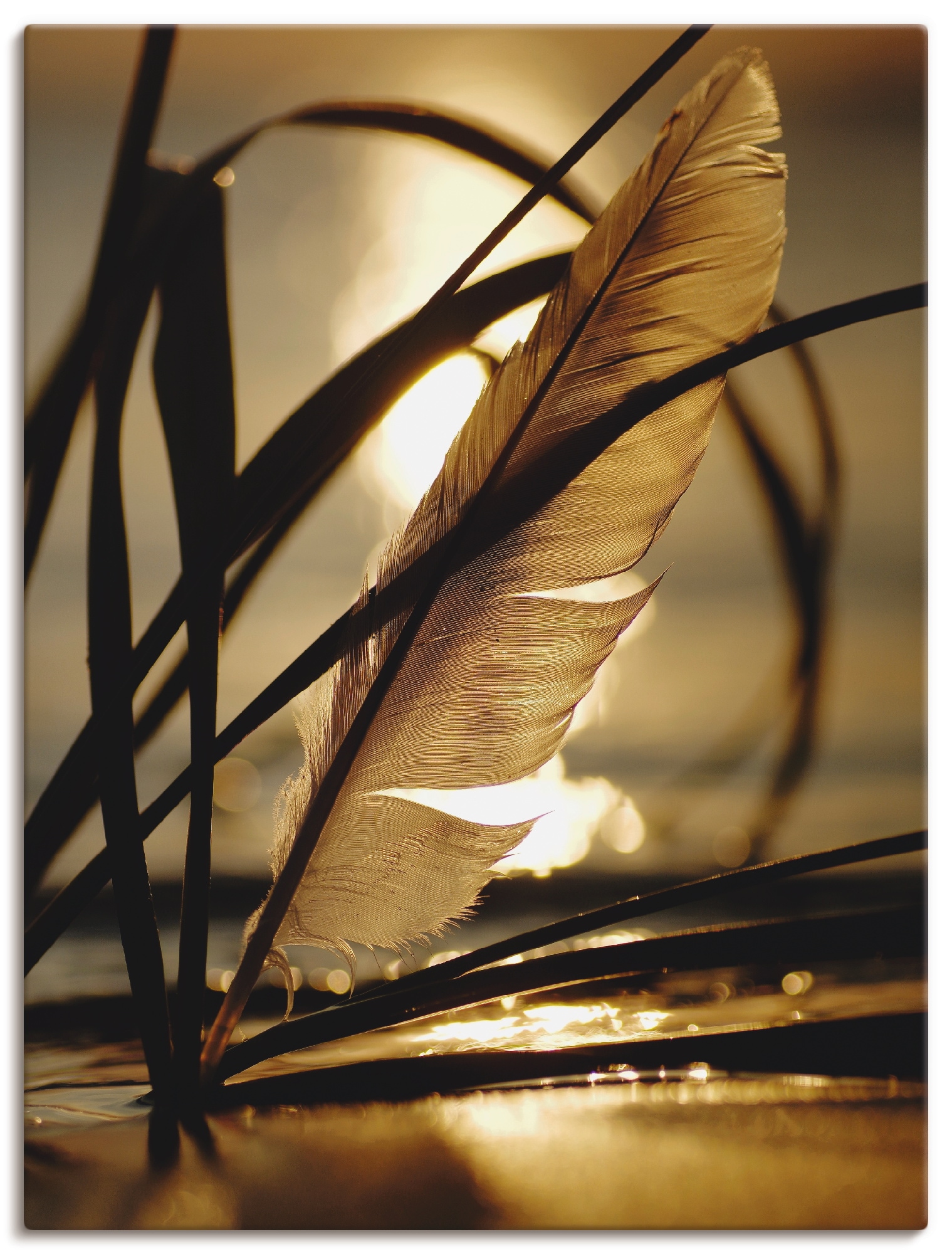 Mit viel Liebe für kunstvolles Wohnen verleiht unser Glasbild mit dem Motiv "Feder im Abendlicht" von Tanja Riedel Deinem Zuhause Charakter. Es begeistert durch hochauflösende Druckqualität und hochwertige Materialien – Made in Germany.