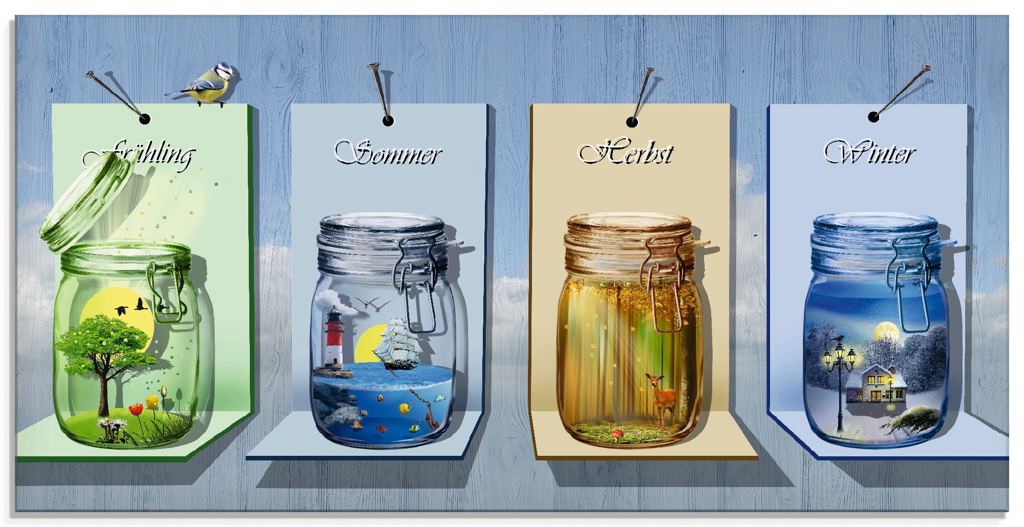 Unser mit Liebe in Handarbeit hergestelltes Glasbild mit dem Motiv "Jahreszeiten in Gläsern" von Mausopardia überzeugt durch originalgetreue Druckqualität und hochwertige Basismaterialien. Das Motiv wird Dir wie abgebildet und fertig zum Aufhängen nach Hause geliefert.