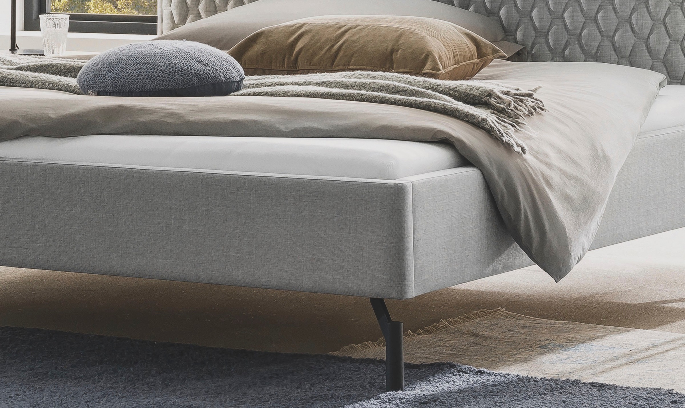 Ein stylisches Polsterbett, das durch seine geraden Linien und schlichten Details überrascht. Der geradlinige Bettrahmen verleiht dem Bett einen modernen Charakter, somit kommt das aufwendig gepolsterte Kopfteil in Wabensteppung und umlaufendem Stehsaum ganz besonders zur Geltung. Der Kopfteilrücken ist im Echtbezug verarbeitet und lässt die Möglichkeitzu, das Bett frei im Raum aufzustellen. Die runden anthrazitfarbigen Metallfüsse sind nach innen versetzt und mit dem Bettrahmen verbunden, sie sorgen für eine lockere moderne Optik. Ein komfortabler Ein- und Ausstieg ist durch die gerundeten Bettoberkanten in Höhe von 43 cm gewährleistet. Die bewährte Hasena Konstruktion mit den innenliegenden Gewindeschrauben und den damit verbundenen Eckwinkeln aus Metall sorgen für hohe Stabilität und langer Lebensdauer. Bei Bedarf ist die Einlegetiefe von Lattenrost und Matratze 4-fach einstellbar, somit ist das Bett auch für höhere Matratzen und Lattenroste geeignet. Ebenfalls erhältlich sind die passenden Beimöbel. 100% erholsamer Schlaf durch Hasena Swiss Bed Concept.