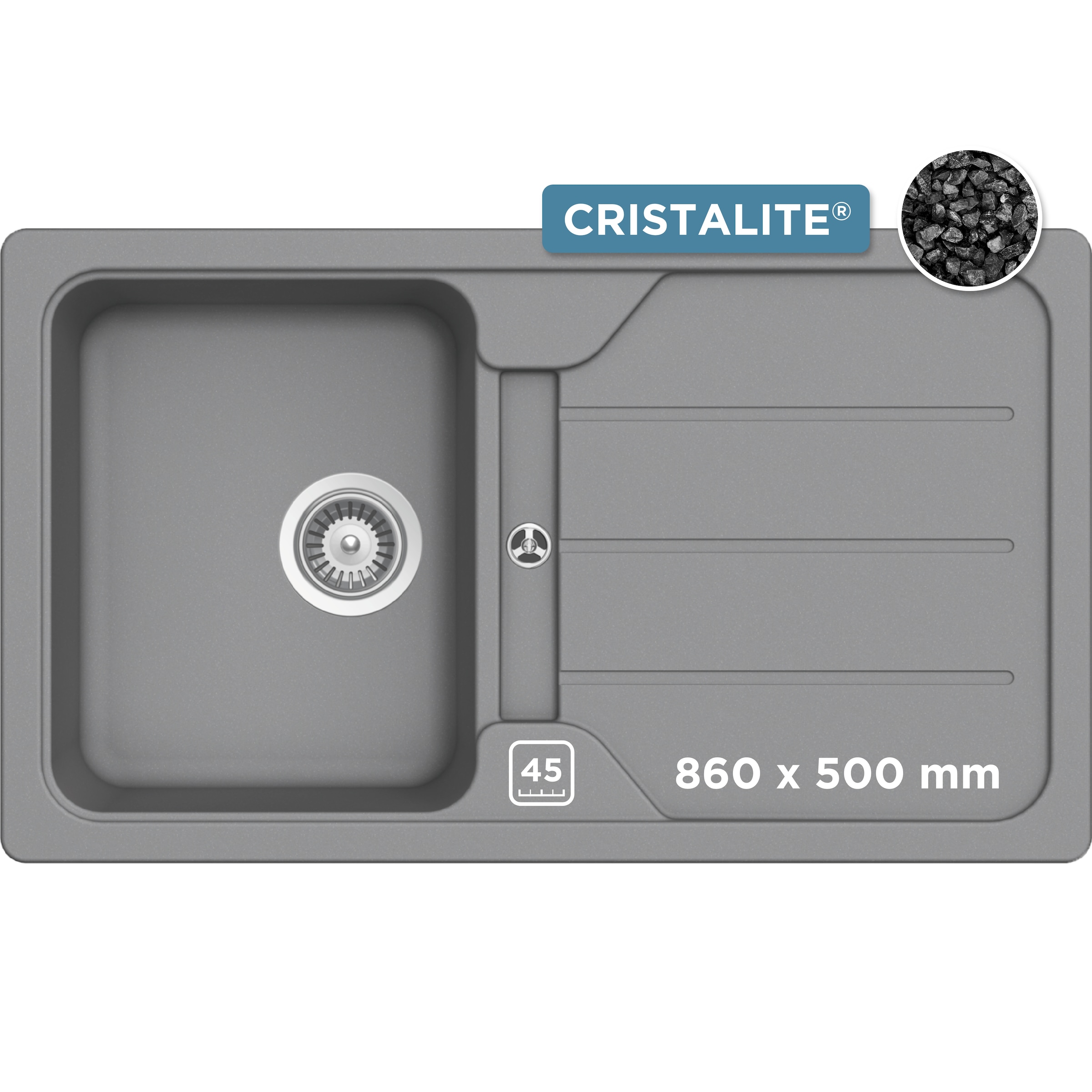 Die Domogranit-Spüle ist vielseitig einsetzbar. Sie ist in 2 Ausführungen erhältlich, mit und ohne Restebecken. Die Spüle kann rechts oder links montiert werden. Die Oberfläche ist einfach zu reinigen und äußerst widerstandsfähig. Inkl. Drehexzenter, erhältlich in 5 Farben und 2 Modellgrößen: Unterschrank 45 cm, Abmessung: 860/500 mm. Unterschrank 60 cm, Abmessung: 1000/500 mm (mit integriertem Restebecken).