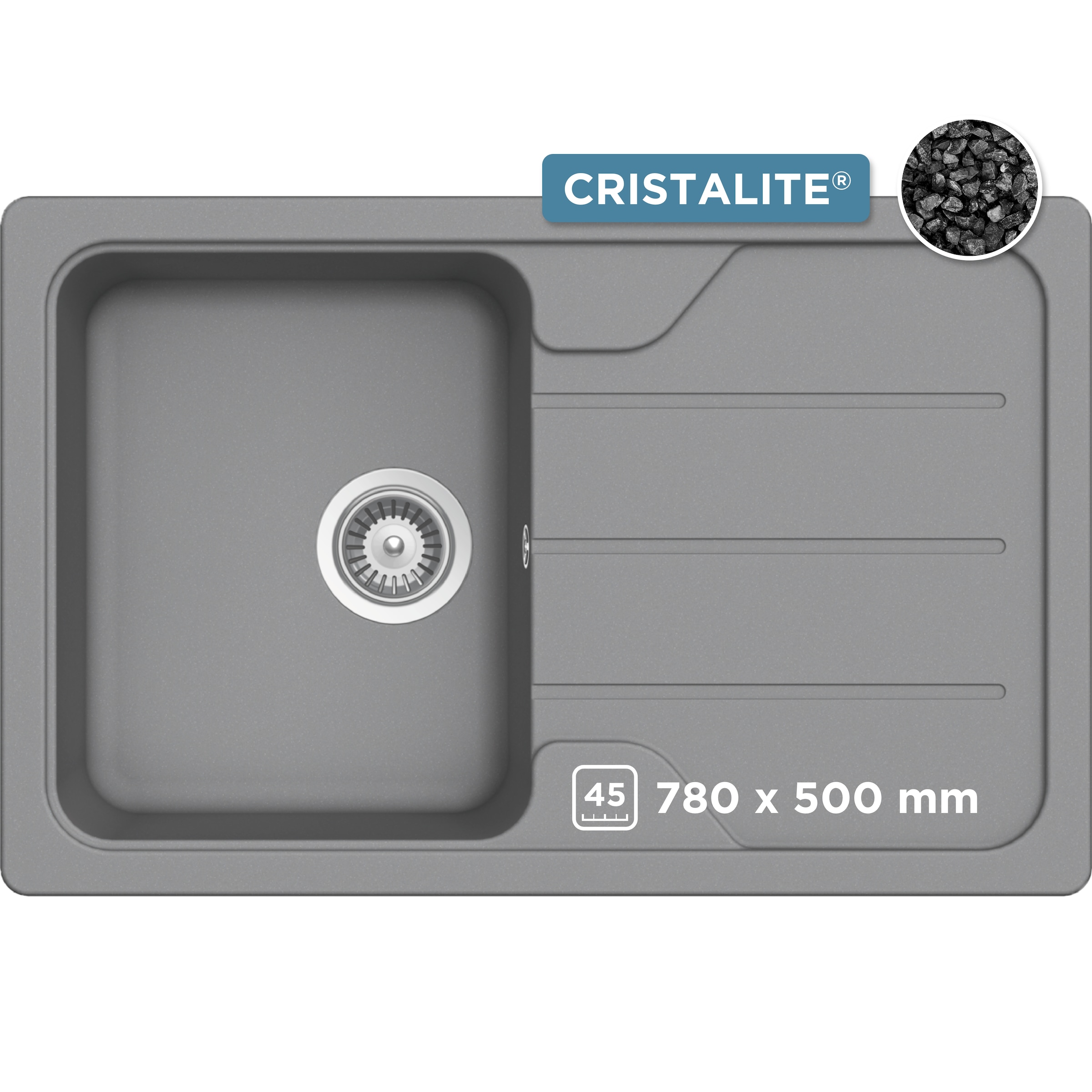 Die verkürzte Abtropffläche eignet sich perfekt für die moderne Küchenzeile in Stadt- und Singlewohnungen. Die Quarzpartikel in CRISTALITE® PLUS schützen die Spüle langfristig vor Abnutzung und sorgen für eine sehr lange Haltbarkeit.