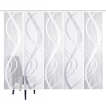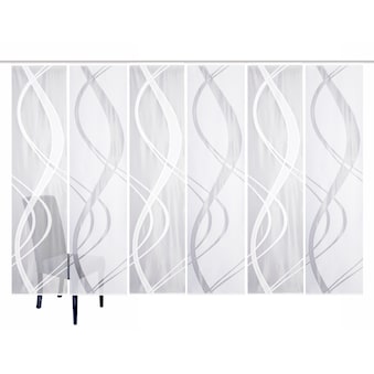 Schiebevorhang aus weißer Jacquard-Wirkware mit dichtem Grund und transparentem Wellen-Motiv. Made in Germany! Der Schiebevorhang TIBASO verbindet klassische Jacquard-Wirkware mit modernem Motiv und ist ein echter Eyecatcher an Ihrem Fenster. Oben mit Kunststoffträgerschiene mit eingehängten X-Gleitern und Gardinenröllchen (passend für alle gängigen Gardinenschienen), unten mit Beschwerungsstange, seitlich geschnitten vollendet der Schiebevorhang seine hochwertige Optik. verpackt in Polytüte, Pflegeleicht, da 100% Polyester. Made in Germany.
