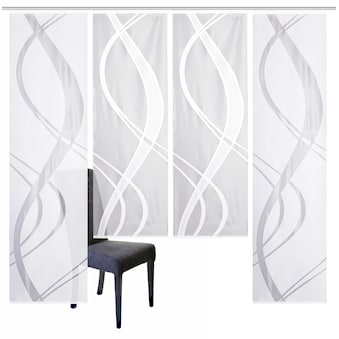 4er Set Schiebevorhang aus weißer Jacquard-Wirkware. Bestehend aus 2 Schiebevorhängen mit blickdichtem Grund und 2 Schiebevorhängen mit transparentem Grund und dichtem Wellen-Motiv. Made in Germany! Der Schiebevorhang TIBASO verbindet klassische Jacquard-Wirkware mit modernem Motiv und ist ein echter Eyecatcher an Ihrem Fenster. Oben mit Kunststoffträgerschiene mit eingehängten X-Gleitern und Gardinenröllchen (passend für alle gängigen Gardinenschienen), unten mit Beschwerungsstange, seitlich geschnitten vollendet der Schiebevorhang seine hochwertige Optik. verpackt in Polytüte, Pflegeleicht, da 100% Polyester. Die Größenangabe bezieht sich auf jeden einzelnen Schiebevorhang. Ideal für eine Fensterbreite von 175-235 cm. Made in Germany.