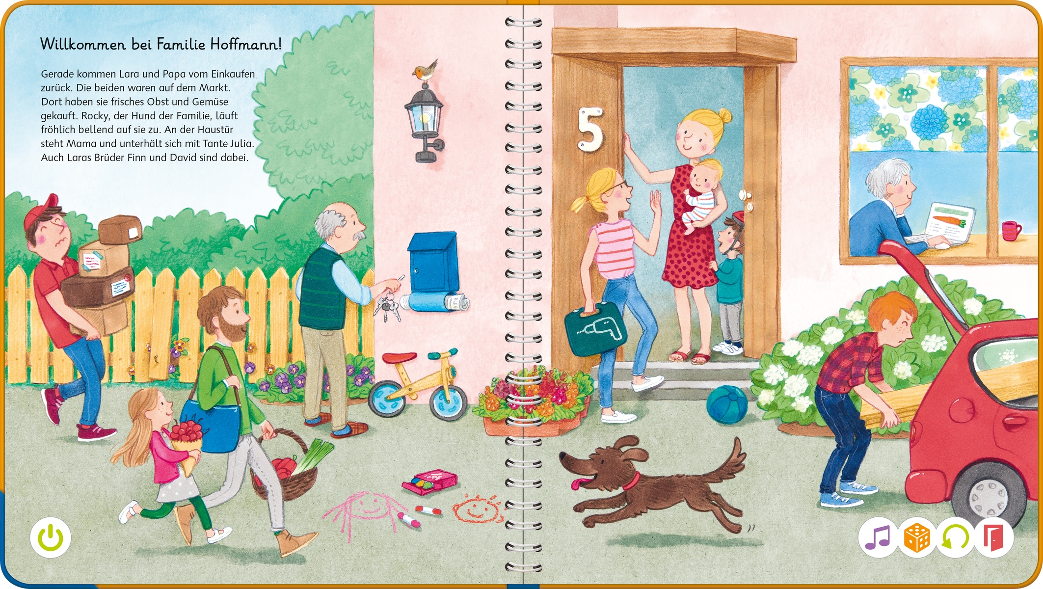 Wörterlernen leicht gemacht: Spielerischer Spracherwerb! Willkommen bei uns Zuhause! Hier wohnen Schulkind Lara, Kindergartenkind David und Baby Finn gemeinsam mit ihren Eltern, Großeltern und Hund Rocky. Mit tiptoi erwacht das Zuhause der Hoffmanns zum Leben. Was gibt es in der Küche zu entdecken? Welche Farben hat das Spielzeug? Was macht man vor dem Zubettgehen? Kinder erweitern spielerisch ihren Wortschatz und verinnerlichen erste grammatische Strukturen. Spiele und Lieder vertiefen den gelernten Wortschatz.