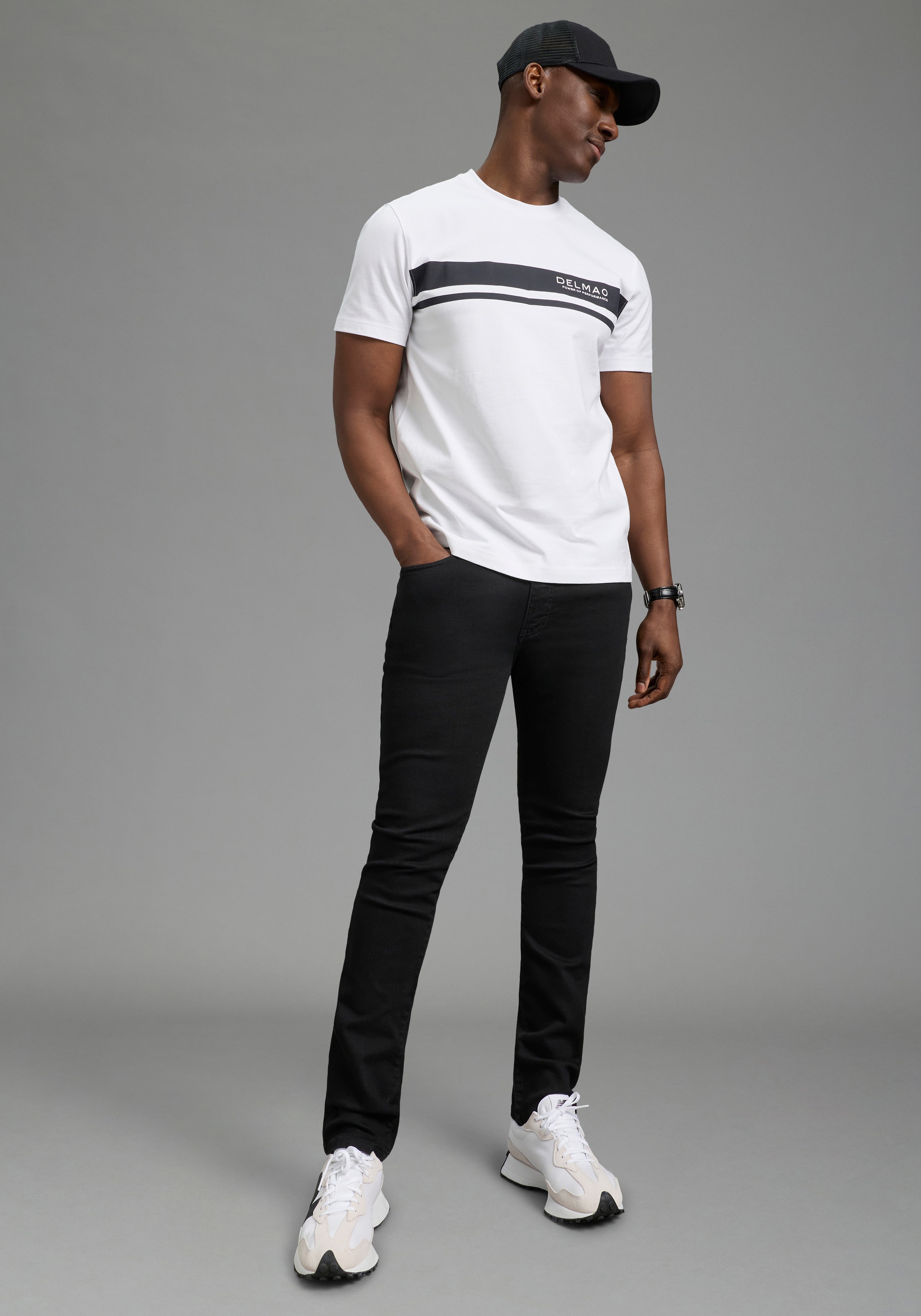 Klassisches T-Shirt für Männer von DELMAO mit Aufdruck. Mit einem normal breiten Schnitt. Kombinierbar für das Freizeit-Outfit. Das Oberteil aus dehnbarem und weichem Single Jersey sorgt für hohen Tragekomfort.