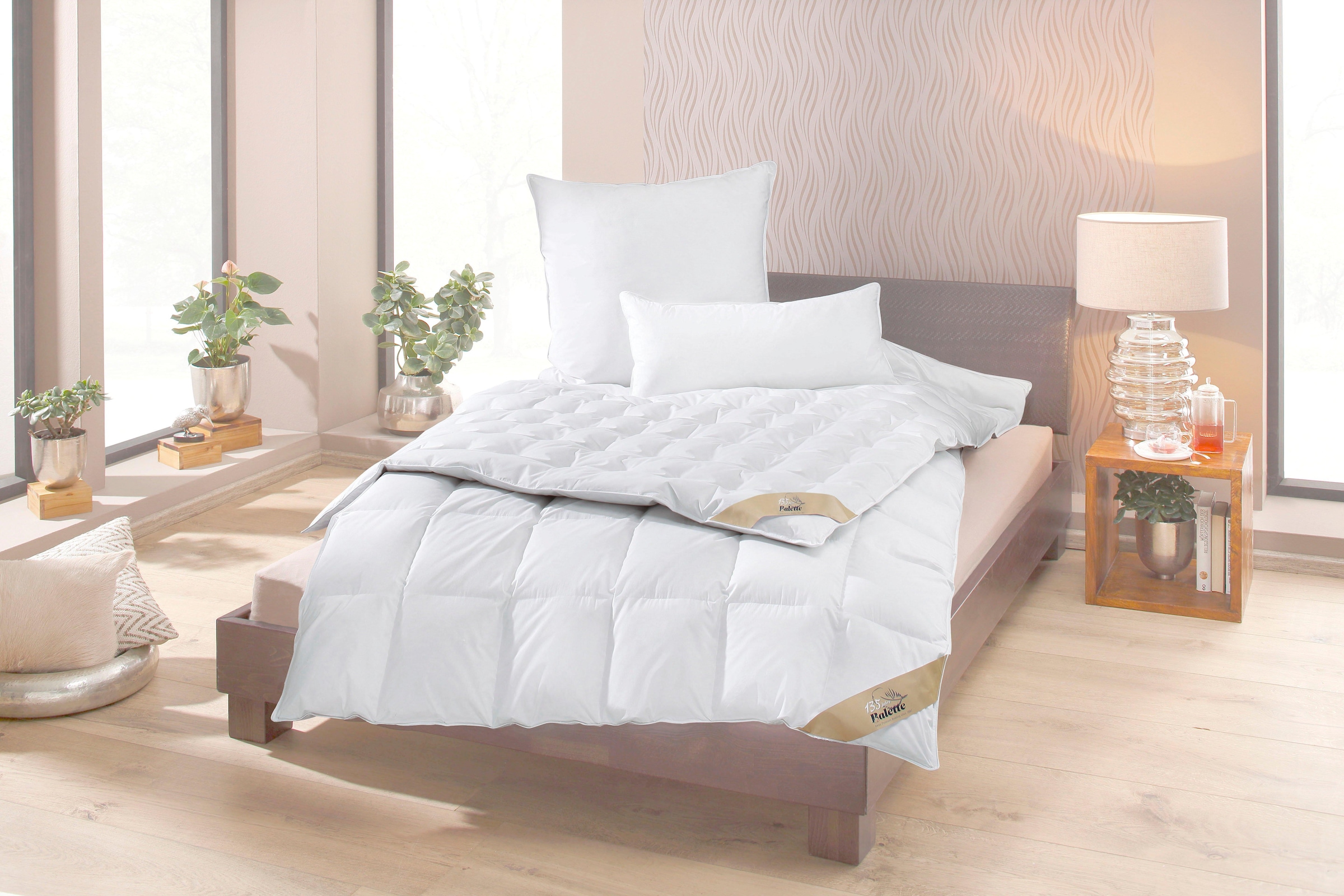 Schlafen mit Wohlgefühl: Bei der hautfreundlichen Daunenbettdecke »Nina« der Marke Balette handelt es sich um ein hochwertiges Produkt mit natürlichen Materialien. Die Füllung besteht aus Entendaunen und -federn. Durch den hohen Daunenanteil ist sie besonders kuschelig und schmiegt sich ideal an den Körper. Der Bezug zeichnet sich als Mako-Einschütte in Baumwollqualität aus. Die umlaufende Satin-Biese und ein Eckband sorgen für die stilvolle Optik. Die Bettdecke ist angenehm wärmend. Dabei verhindern die Kassettenverarbeitung und die Punktsteppungen ein Verrutschen der Füllung. Die Daunendecke lässt sich hygienisch bei bis zu 60°C in der Maschine waschen und anschließend in den Trockner geben. Durch die NOMITE-Ausstattung ist das Daunenbett auch für Allergiker bestens geeignet. Behaglich schlafen, erholt in den Tag starten: die hautfreundliche Balette Daunenbettdecke »Nina«. Dem sehr feinen Bezugsstoff der Bettdecken wurde das Siegel »Allergikerfreundlich« und »Hautfreundlich« vergeben.