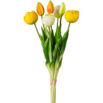Highlight Tulpen-Strauß! Mit dem traumhaft schönen Tulpen-Bund verleihst du deinem Zuhause schnell und einfach Frühlingsflair. Die gefüllten Tulpen präsentieren sich als Bund und in Real-touch-Ausführung, so dass eine authentische Optik entsteht. Pflegeleicht wird der Bund aus 7 Tulpenstielen Jahr für Jahr deine Deko bereichern. Sie werden in all deinen Räumen zum Blickfang. Die Tulpen sind in den Farben Rosa-Mix, Gelb-Mix und Bunt erhältlich.