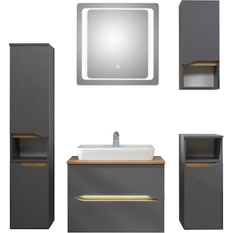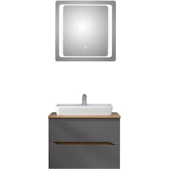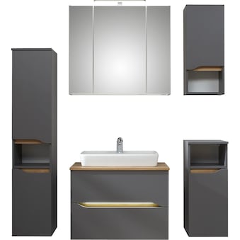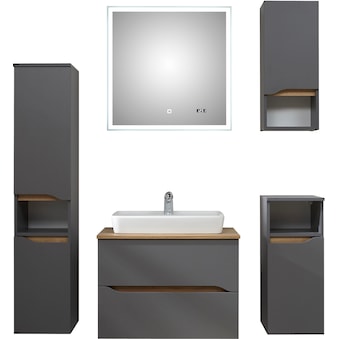 - Maße: Keramikwaschtisch B75xT45xH2 cm; Waschtischunterschrank B72xT44xH51,3 cm; Spiegelschrank B80xT16xH70 cm; Midischrank B30xT33xH141 cm