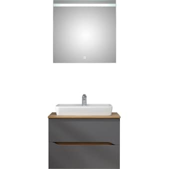 - BxTxH in cm: Keramikwaschtisch B75x45x2; Waschtischunterschrank 72x44x51,3; Spiegelschrank 80x16x70; Unterschrank 30x33x72; Hängeschrank 30x20x70; Midischrank 30x33x141