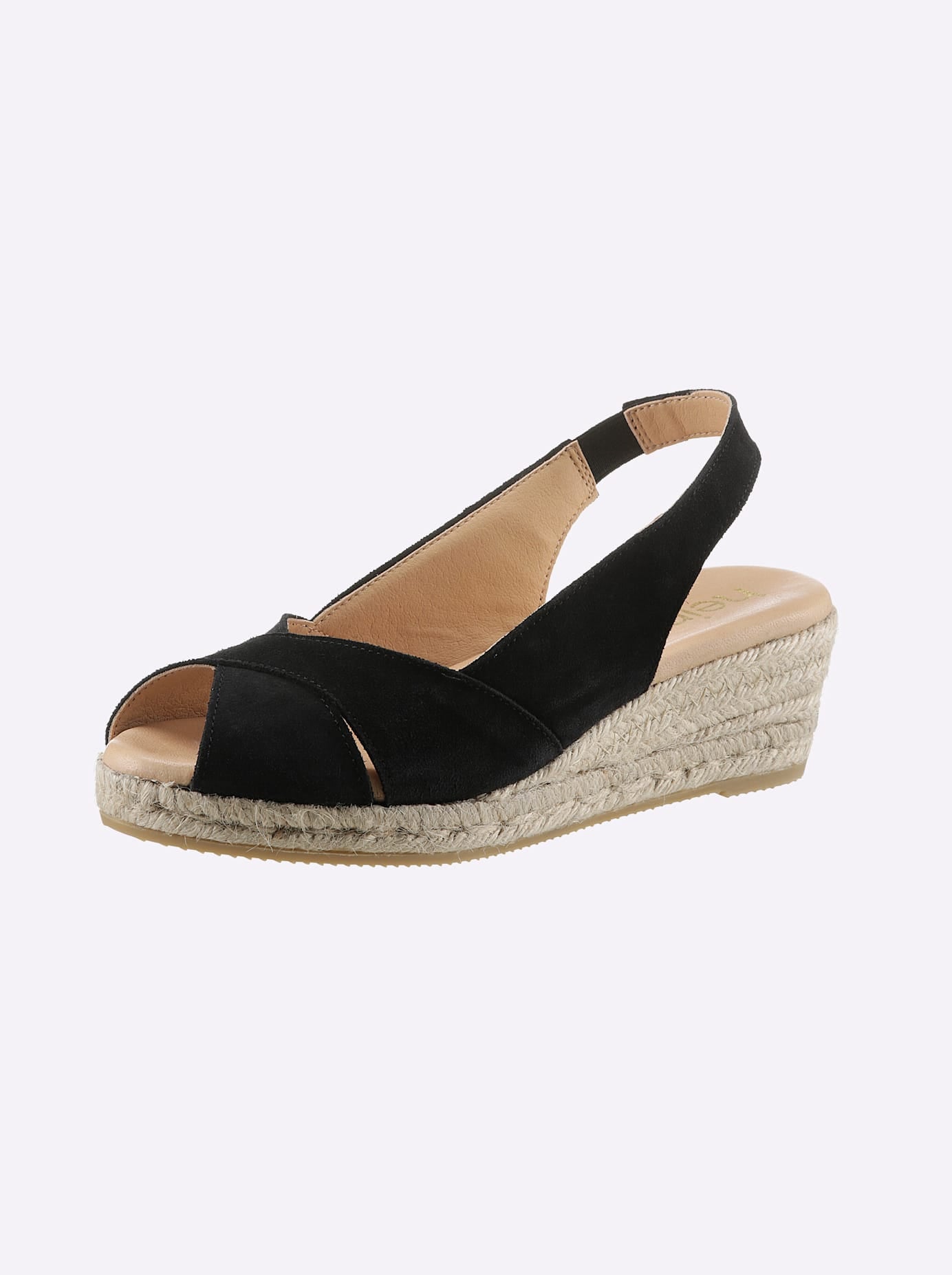 Sandalette Made in Spain. In topaktueller Metallic-Optik. Goldfarben aus Ziegen-Nappaleder, schwarz aus Rind-Veloursleder. Fersenriemen mit Gummizug. Futter Textil. Innensohle Leder. Plateauhöhe ca. 15 mm. Absatzhöhe ca. 40 mm.