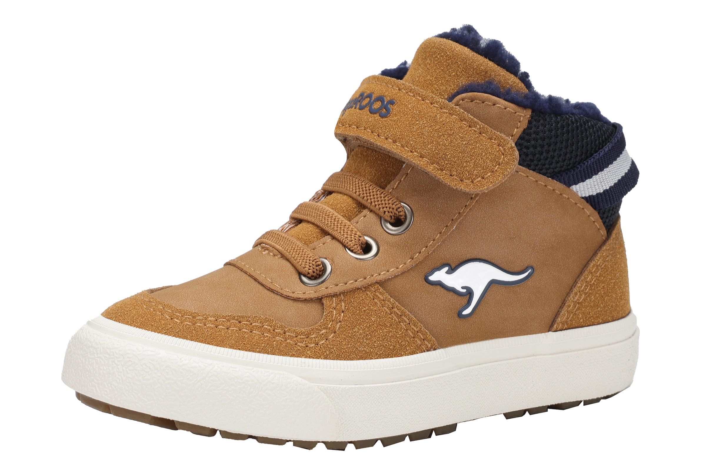 Sportlich und bequem — die Sneaker von KangaROOS sind das, was die coolen Kids wollen. Der Schuh hat einen knöchelhohen Schaft und eine runde Spitze sowie einen Klettverschluss. Damit geht das An- und Ausziehen ganz einfach und schnell. Mit der leicht profilierten Sohle ist es nicht mehr so rutschig. Das Obermaterial aus Textil ist strapazierfähig und pflegeleicht. Der Schuh kann gut mit einem gestreiften Langarm-Shirt und einer bequemen Latzhose getragen werden, wenn es nach draußen geht.