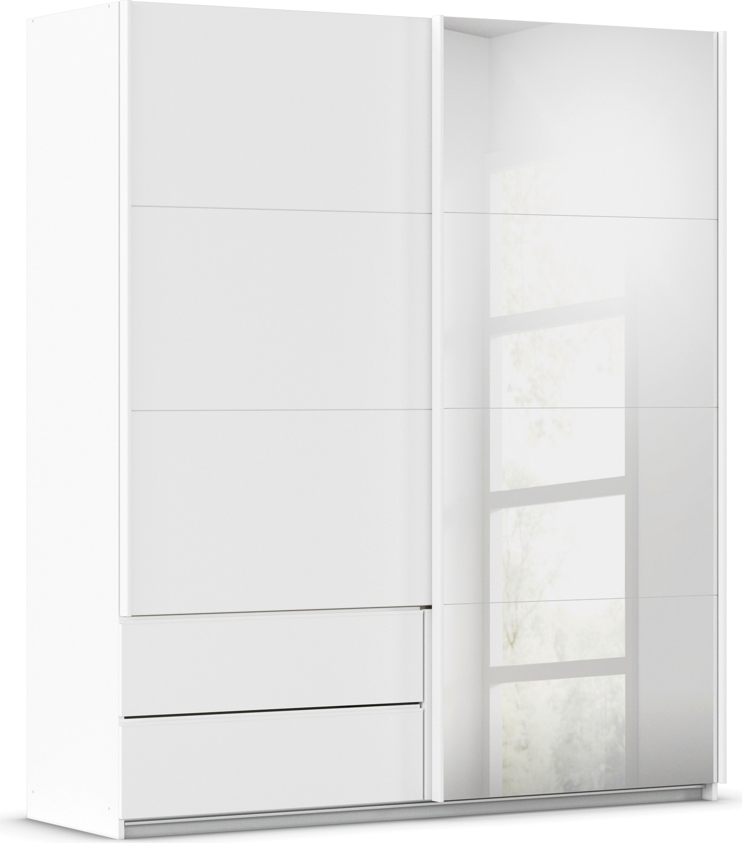 - Schwebetürenschrank mit praktischen Schubladen auf Schrankfront, optional in Absetzungsfarbe