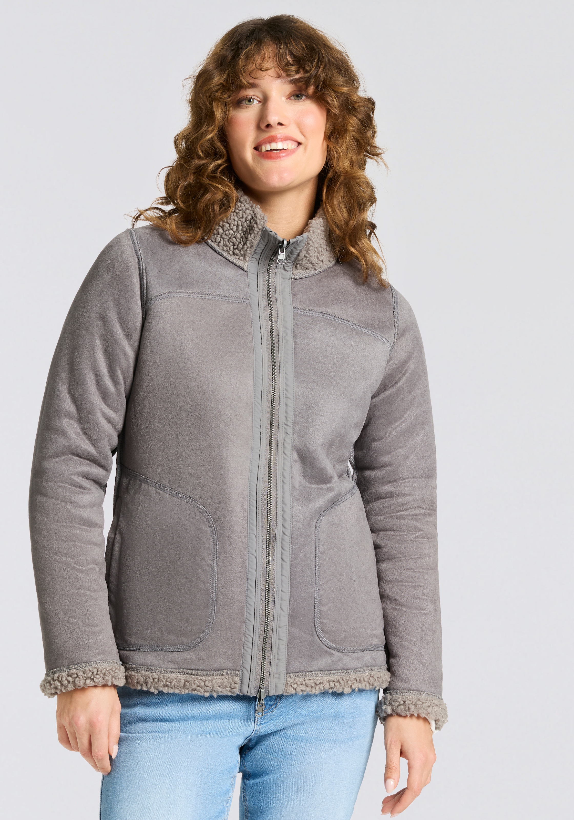 Die Damen Wendejacke in Wildlederoptik von G.I.G.A. DX ist besonders weich und hält in der kalten Jahreszeit kuschelig warm. Sie lässt sich wenden und je nach Bedarf mit der Wildleder- oder der Sherpa Fleece-Seite nach außen tragen. Zudem hat sie innen und außen je zwei Eingrifftaschen.