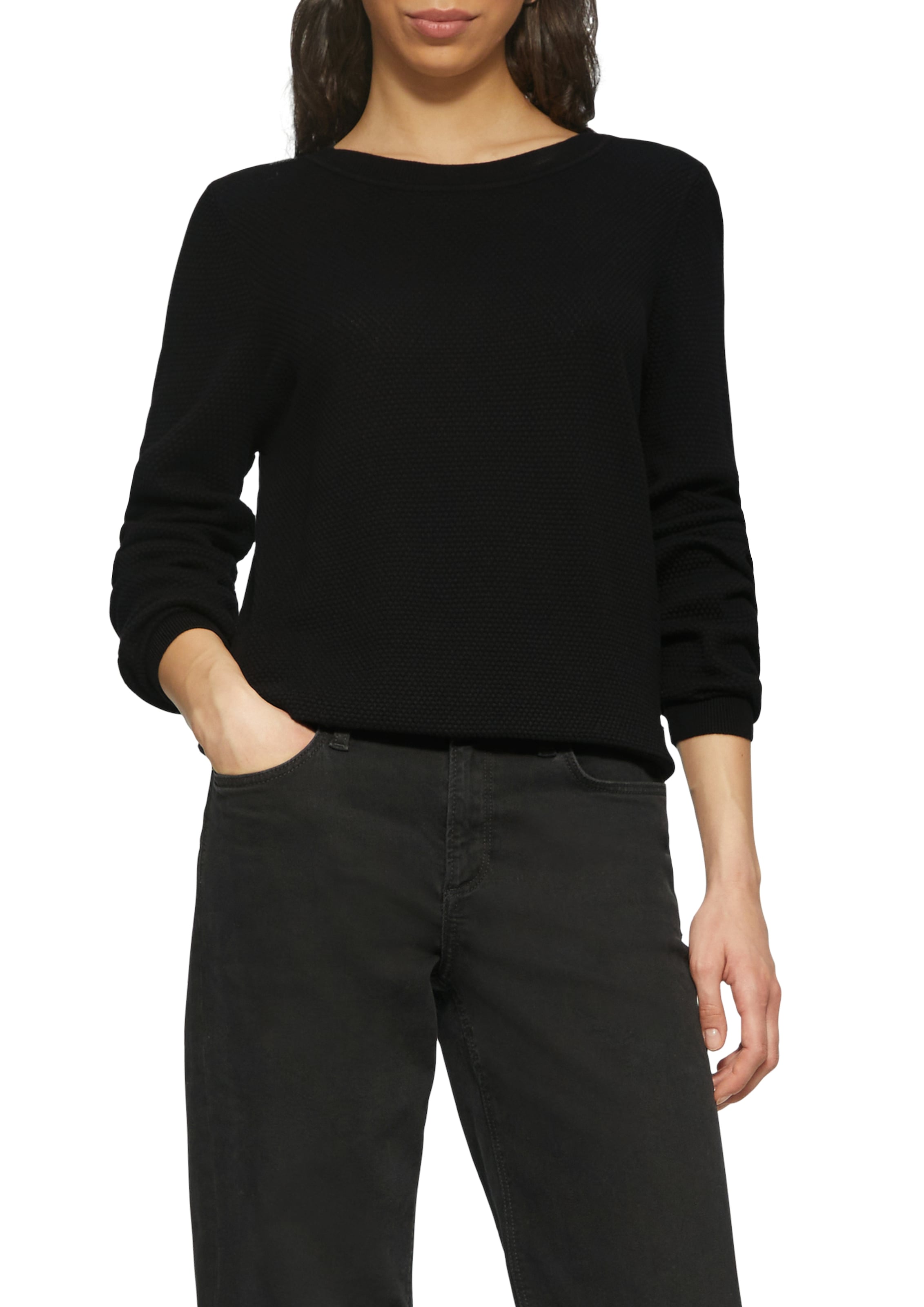 Klassischer Damen-Rundhalspullover von Marc O'Polo DENIM. Mit einem anliegenden Schnitt. Der Rundhals-Ausschnitt zeigt sich mit einem Rippbündchen. Die Ärmel sind lang. Durch die hohe Dehnbarkeit des Rippstricks passt sich das Oberteil der Körperform an.
