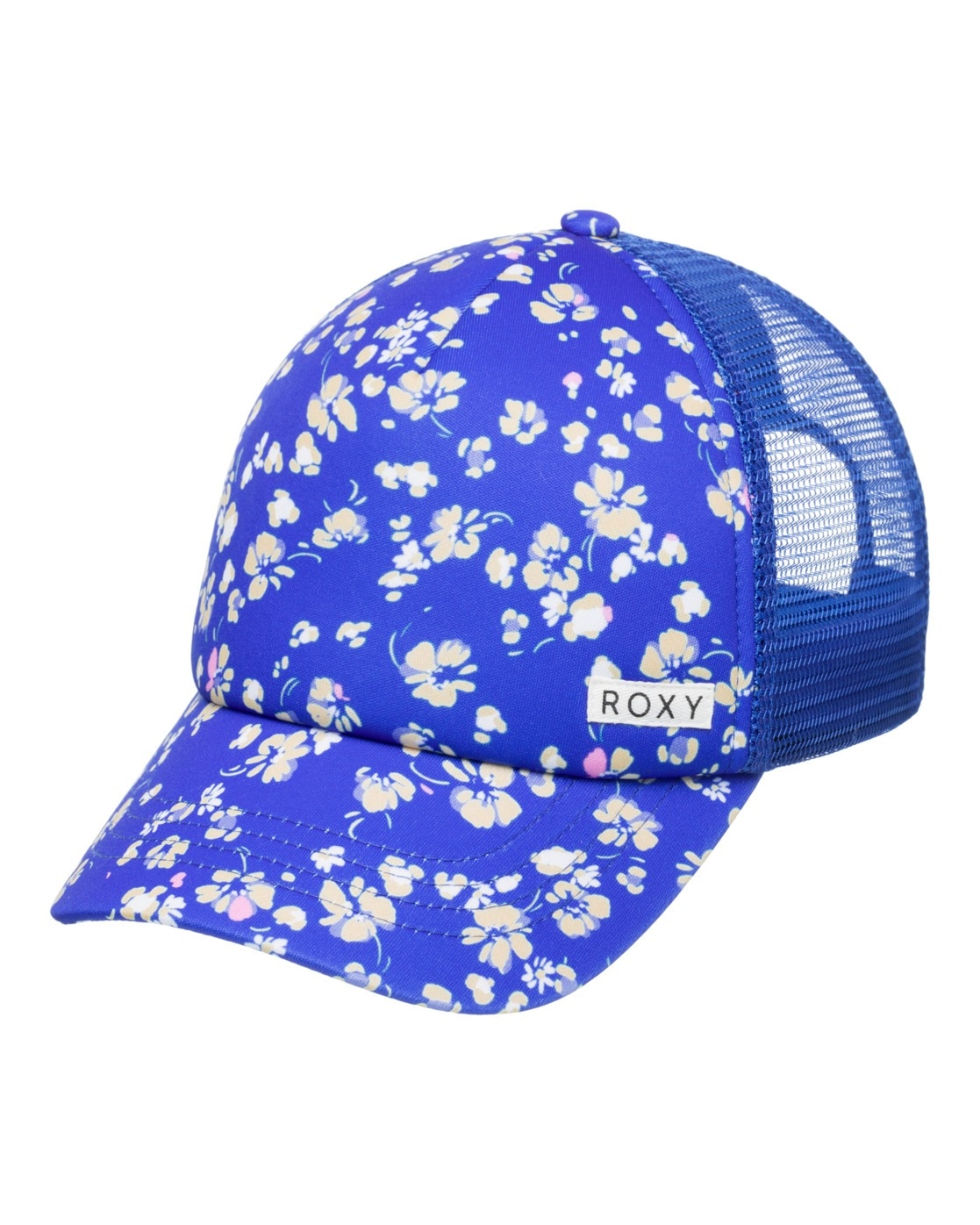 Truckerkappe für Mädchen. Die Eigenschaften dieses Produkts sind: Stoff: Polyester-Gewebe, Design: J-Form mit 6 Panelen, Verschluss: Verstellbarer Verschluss hinten, Visier: gebogener Schirm, Größe: 55 cm Ø, Logo: ROXY-Patch aus Baumwollstoff und Andere Features: Mesh hinten.