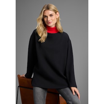 Modischer Damen-Sweater von Laura Scott mit Blumenmuster. Mit einem hüftbedeckenden und normal breiten Schnitt. Der Ausschnitt hat ein Rippbündchen. Die Ärmel sind lang. Das Oberteil ist weich und angenehm auf der Haut dank der angerauten Innenseite aus Sweatstoff.