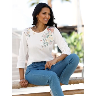Mit dem farbenfrohen Mustermix zieht dieses 3/4-Arm-Shirt alle Blicke auf sich. Trendige Silhouette mit Rundhals-Ausschnitt und überschnittenen Schultern. Hautsympathische Qualität. 100% Baumwolle. Maschinenwäsche.