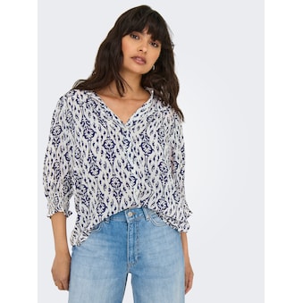 Tunika mit V-Schlitz und Knopf am Rundhalsausschnitt. Die gecrinkelte Qualität lässt durch die eingewebte Punktestruktur einen 3D-Effekt entstehen. Die 3/4-Ärmel enden mit offenen Bündchen, kleine Fältchen unterhalb der Rückenpasse lassen das Oberteil locker fallen.