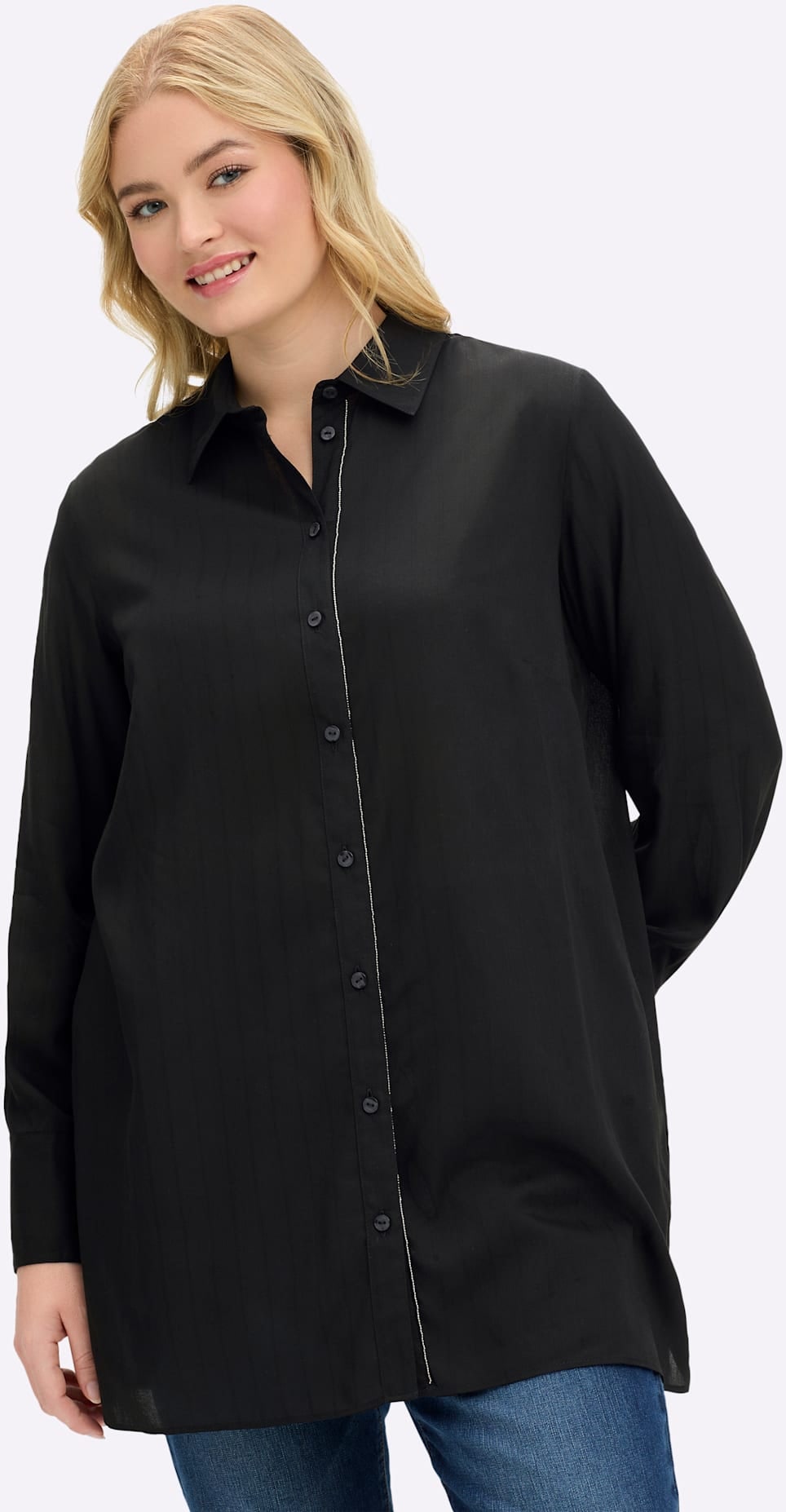 Die Bluse ist ausgestellt geschnitten und fällt so locker auch über die breitere Hüfte – perfekt für die A-Figur. Die dezenten Längsstreifen strecken optisch, das kontrastfarbene Tape unterstreicht den schmeichelnden Effekt.