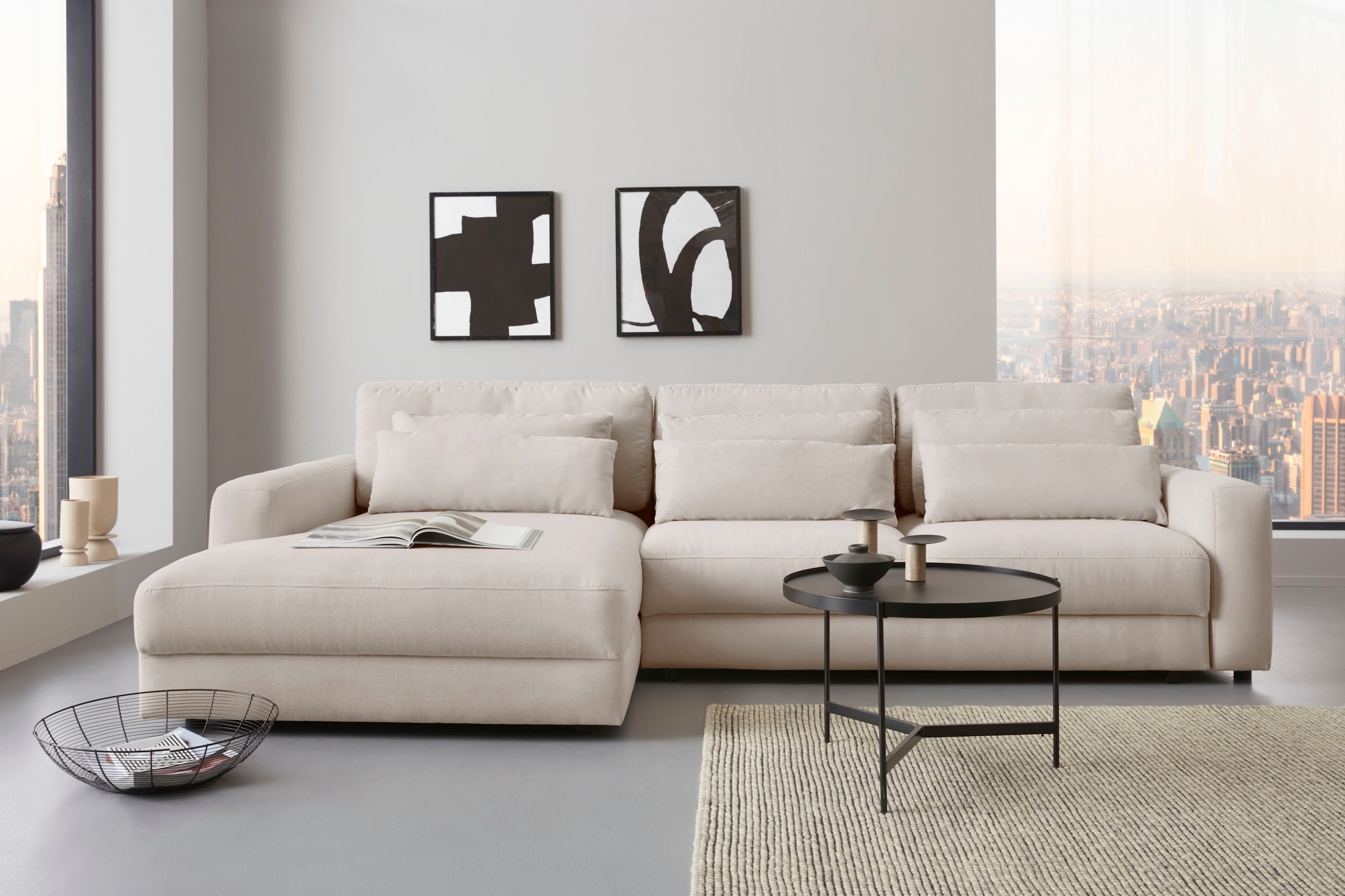 Home affaire Wohnlandschaft »LAKESIDE mit Bettfunktion und Bettkasten, Maße B/T/H: 332,5/142/84 cm« U‑Form mit vielen Kissen und Wellenunterfederung