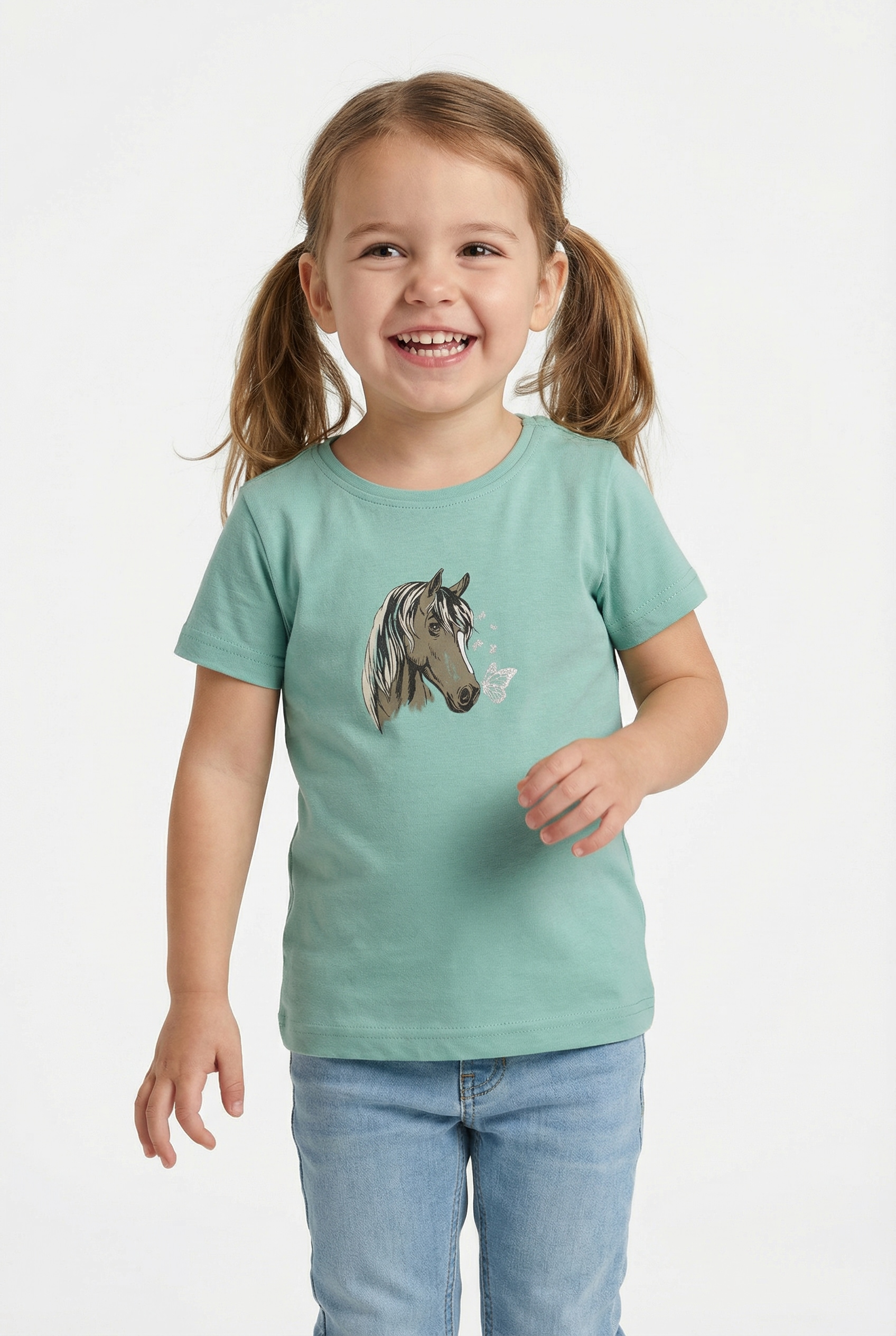 Angesagtes T-Shirt für Mädchen von Blue Seven für kleine Pferdefreunde mit Tier-Motiv. Mit einem normal breiten Schnitt. Es ist mit funkelndem Glitzerdruck versehen. Das Oberteil bietet viel Bewegungsfreiheit durch den dehnbaren und zarten Single Jersey.