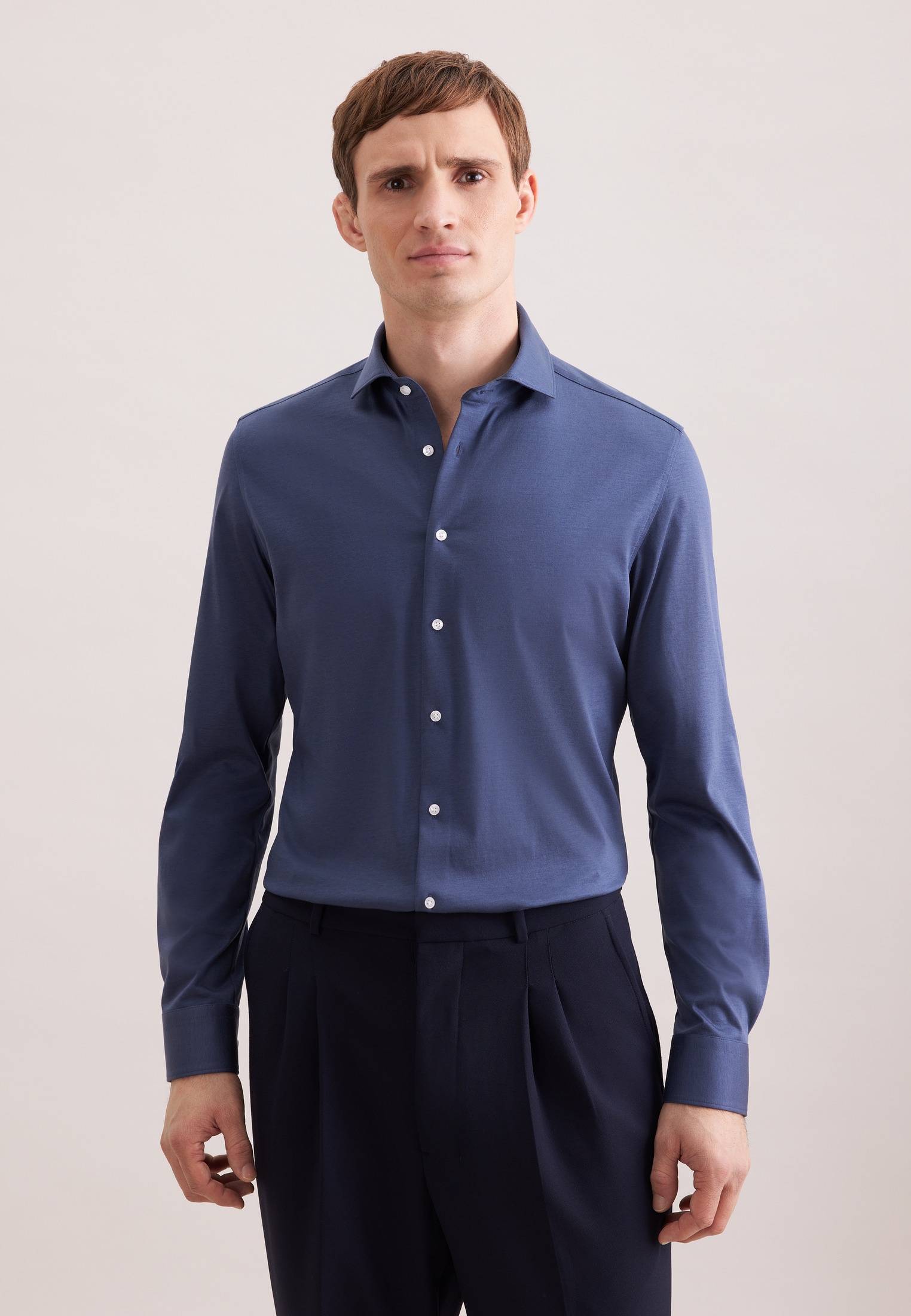 Maskuline Ästhetik: Das 1/1-Jerseyhemd von Seidensticker aus der "SMART PERFORMANCE" Kollektion erweitert Ihre Garderobe um einen hochwertigen Look, der den Geist der Zeit trifft. Es ist ein vielseitiger Klassiker, der sich ideal für Freizeit, Reisen oder Büro eignet und überall überzeugt. Als Slim Fit ist das Jerseyhemd eher schmal und figurbetont. Dieses Hemd verkörpert zeitlose Eleganz mit modernem Schliff. Besonders hervorgehoben wird der universelle Business-Charakter durch einen Kentkragen.