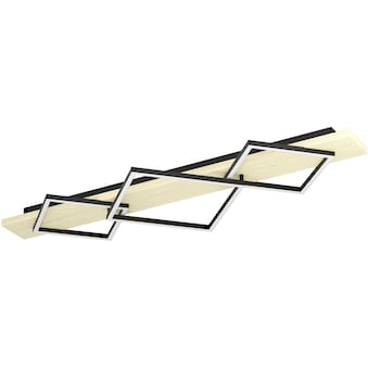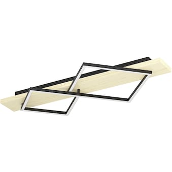 - Quadratischer LED-Rahmen „schwebt“ optisch vor der massiven Holzrückwand – kontrastreicher Mix aus warmem Holz und schwarzem Metall schafft moderne Ästhetik