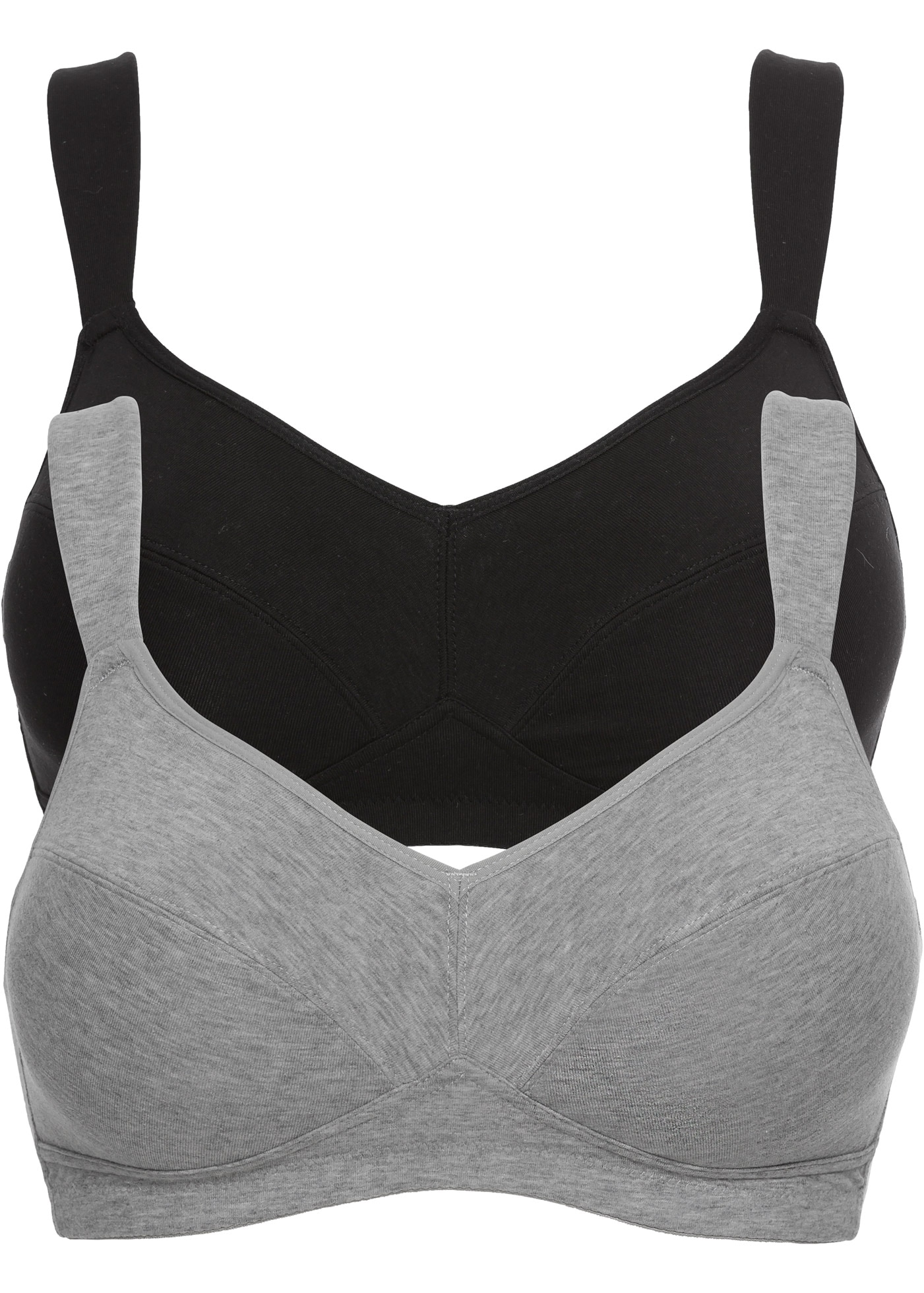 Diesen schlichten BH muss Frau einfach lieben! Er ist aus weicher Baumwolle ohne Bügel gefertigt und kommt direkt im vorteilhaften Multipack. Formgebende Teilungsnähte und eine cleane Optik verleihen ihm den modischen aber unaufdringlichen Look, während die breiten, verstellbaren Träger und das elastische Unterbrustband den Komfort erhöhen. Zu schließen ist das Wohlfühlwunder über einen Haken-und-Ösenverschluss an der Rückseite und fällt wie die Träger, in größeren Cup-Größen etwas weiter aus.