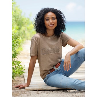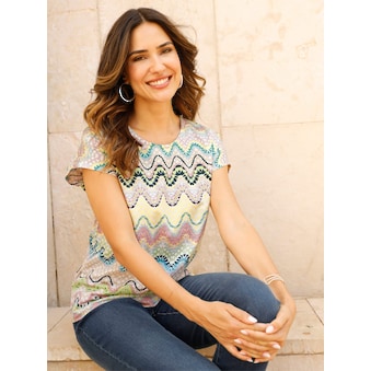 Dieses kaschierende Flammgarn-Shirt überzeugt mit seiner originellen Gestaltung. Zum Saum hin ist es leicht ausgestellt und umspielt die Figur. Hübsche Details sind der Rundhals-Ausschnitt mit Zierknopfleiste und die Spitzenverzierung am Dekolleté. Das hüftbedeckende Flammgarn-Shirt mit kurzen Ärmeln sieht zu einer hellen Hose prima aus und lässt sich zu einer Jeans, Chino- oder Caprihose ebenfalls super tragen.