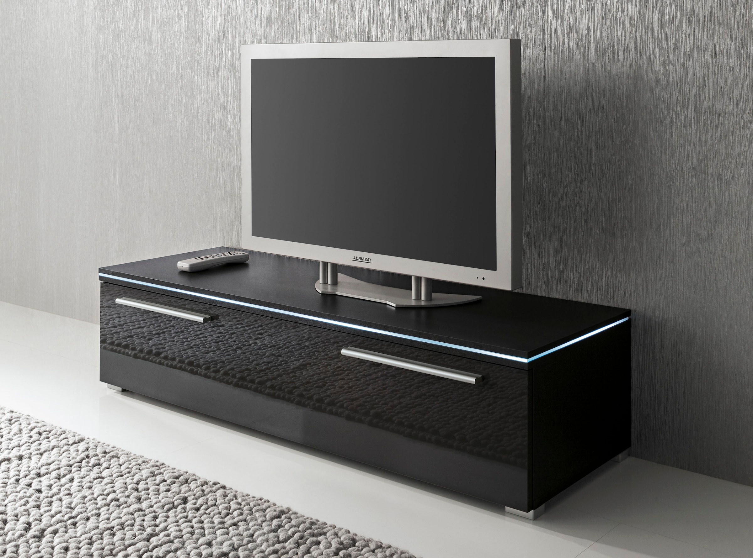 Wissenswertes | Topmodernes Anbauprogramm mit tollen Lichteffekten (Beleuchtung optional). In 3 Farben: schwarz, weiß oder grau. Mit hochglänzenden Fronten. Klappen mit Klappenhalterung. Mit 1 Klappe. Innen 2 Fächer. Fachmaße, B/T/H: je 57/36/22 cm. Tragkraft Oberboden max. 40 kg. Maße (B/T/H): 120/40/30 cm. Alles ca.-Maße. Selbstmontage mit Aufbauanleitung. Passende Beleuchtung bitte extra bestellen. Wir empfehlen eine 3er-LED-Glaskantenbeleuchtung in weiß (Artikelnummer: 824150) oder in blau (Artikelnummer: 824178). |