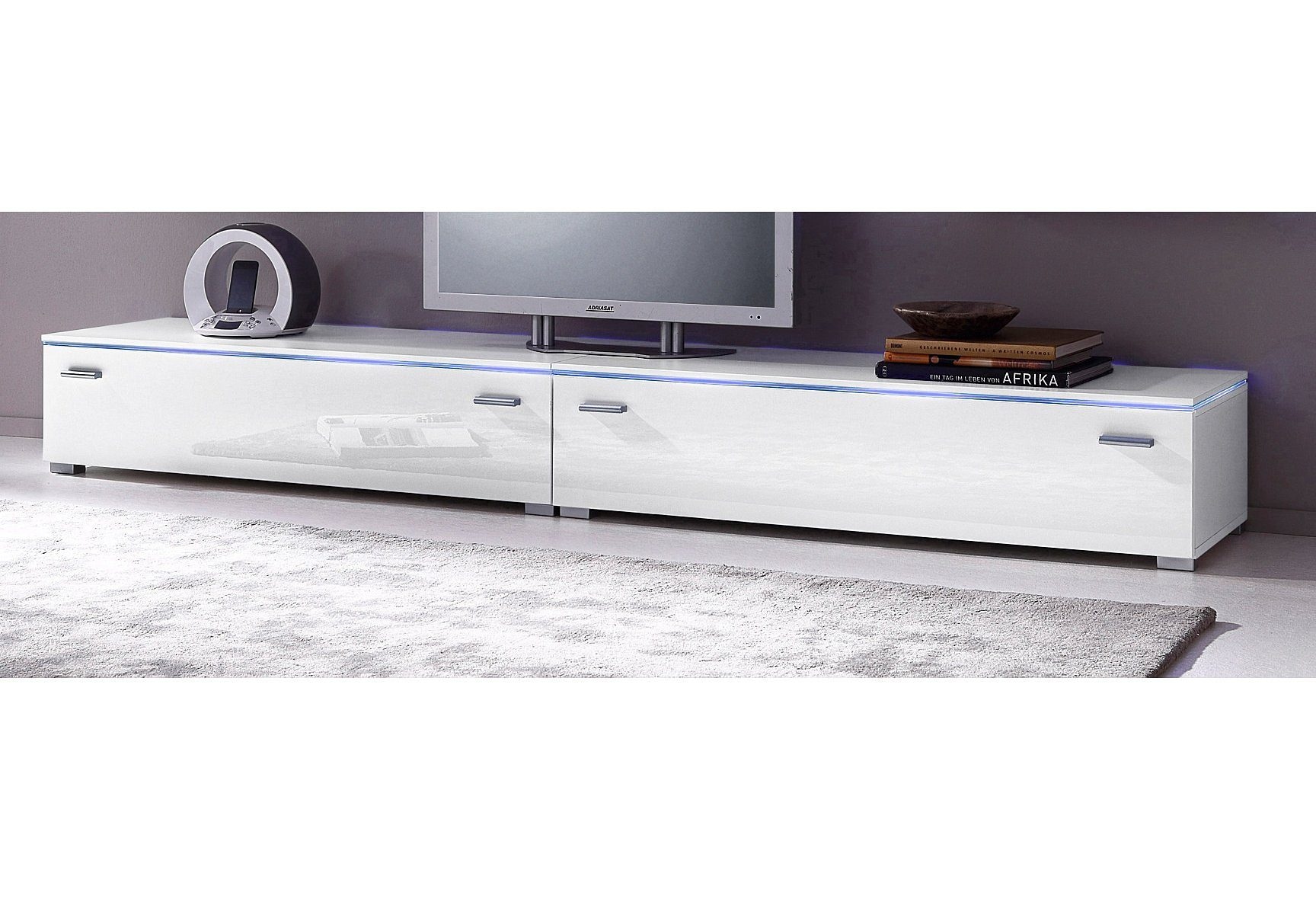 Wissenswertes | Schönes Lowboard mit pflegeleichter Oberfläche! In 3 Farben: Korpus matt, Fronten hochglänzend in Grau, Weiß und Schwarz. Oberböden beleuchtbar. Ganzmetall-Scharniere. Lowboard mit 1 Klappe (Bremshalterung). Innen ein Doppelfach, Fachmaße (B/T/H: je 46/36/19 cm. Tragkraft Oberboden max. 40 kg. Maße (B/T/H): 110/42/27 cm. Alles ca.-Maße. Selbstmontage mit Aufbauanleitung oder wahlweise mit Aufbauservice. Beleuchtung bitte extra bestellen. Wir empfehlen für das Lowboard 1x 3er Set LED-Glaskantenbeleuchtung in blau (Artikelnummer: 800446) oder in weiß (Artikelnummer: 824175). Inkl. Trafo und Zuleitung. |