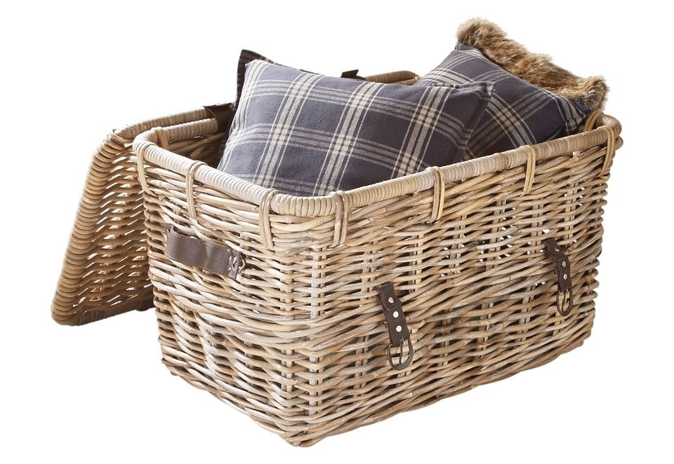 Kubu-Rattankorb. Praktisch und vielseitig einsetzbar. Rahmen aus Rattan, mit Kubu-Rattanrohr, grau, handgeflochten. Aufklappbarer Deckel mit 2 Verschlußschnallen, darunter Stauraum (ca. 52/34/33 cm). Inkl. 2 Tragegriffen, Griffe und Schnallen aus Kunstleder (100% PVC). Maße ca.: (B/T/H) 60/40/38 cm.
