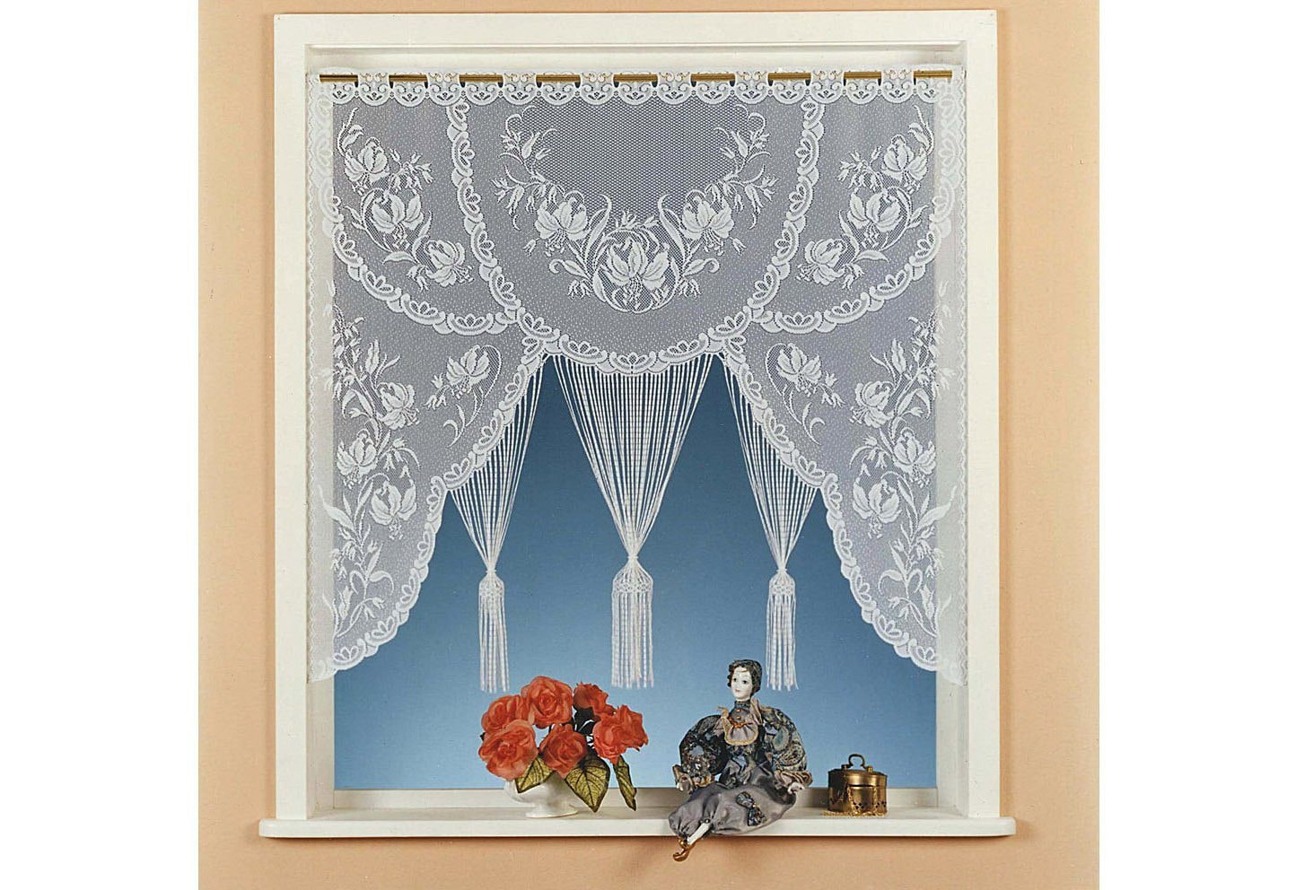 Die besondere Scheibengardine aus feinem halbtransparenten Jacquard-Stoff. Mit den bereits zusammengefaßten Fäden für jedes Auge ein Blickfang. Mit Stangendurchzug zum leichten Anbringen direkt am Fenster.