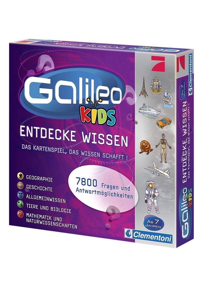 Galileo Kids, Clementoni. Entdecke Wissen. Mit 7800 Fragen/Antwortmöglichkeiten zu wichtigen Schulthemen. Einsteins von morgen aufgepasst. Ein Wissensquiz für die schlauen Kids von Clementoni mit 7800 Fragen und Antwortmöglichkeiten. Unterschiedliche Themengebiete wie Geschichte, Mathematik, Geografie, Tiere, Biologie und Allgemeinwissen sind der Altersgruppe bei dem Quiz Galileo Kids Entdecke Wissen entsprechend angepasst.