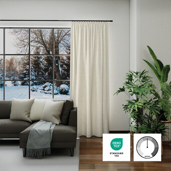 Dieser schwere Dekoschal der Marke »Neutex for you!« hat nicht nur eine schöne Optik, sondern bietet Ihnen technisch noch viele Vorteile. Er ist schall- und wärme- bzw. kälteisolierend und ist zudem noch verdunkelnd. So wärmt er den Raum in der Winterzeit und kühlt ihn im Sommer. Sie müssen lediglich durch Ziehen der Fäden am Kräuselband die gewünschte Breite erreichen. Gardinenröllchen oder Ringe einhaken und den Schal an einer Gardinenschiene oder Stange dekorieren. An diesem schönen Artikel werden Sie sicherlich viel Freude haben und er spart dazu noch Energie !