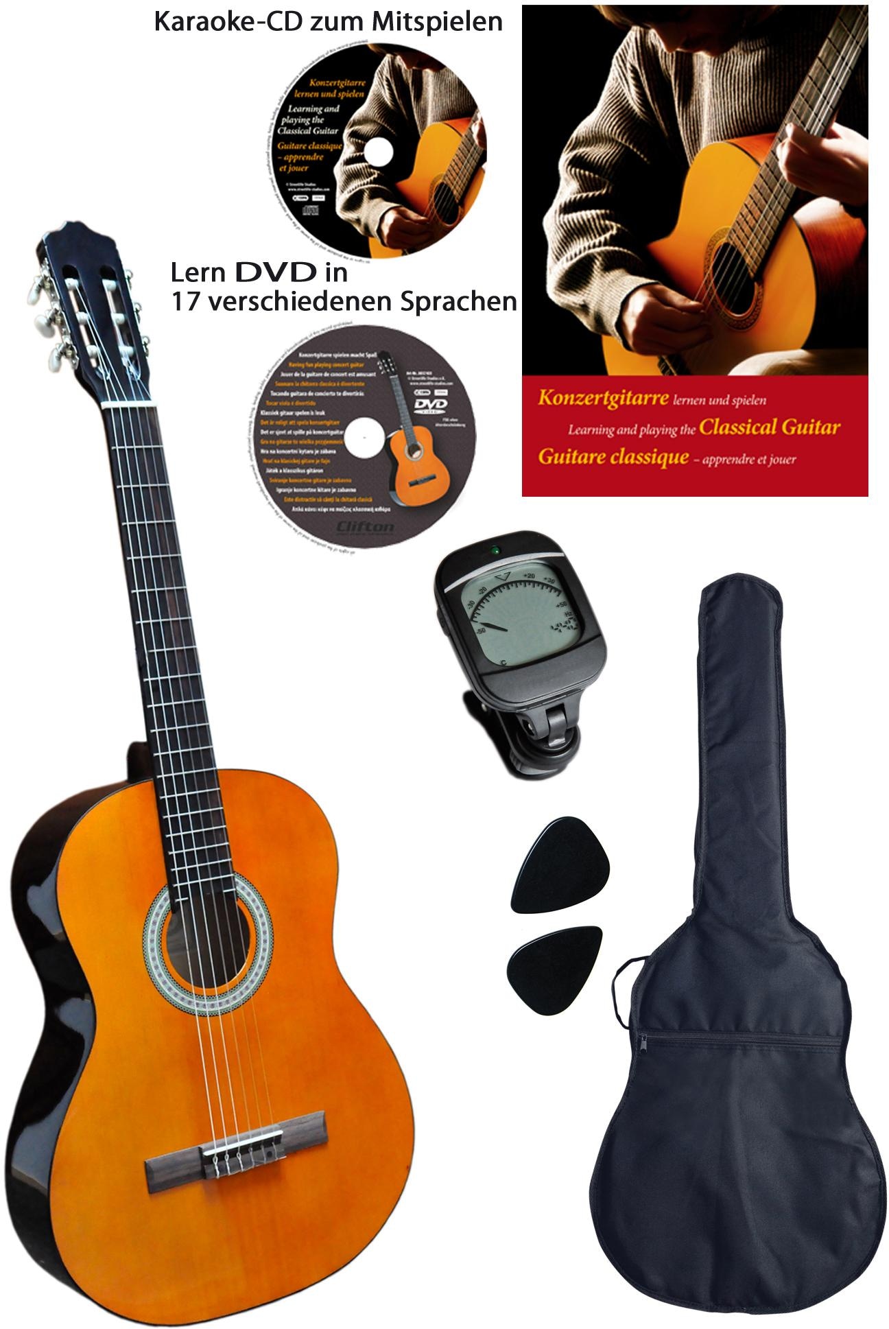 Set: Kindergitarre + Zubehör, »Clifton Konzertgitarren ¼«. Dieses Instrument bietet den perfekten Einstieg in die Gitarrenwelt. Bei der Konzert-Gitarre handelt es sich um ein hochwertiges Holzinstrument, in Handarbeit gefertigt. Die Gitarre hat eine getönte und laminierte Fichtendecke und ist für den Musikunterricht bestens geeignet. Die Mensur, die Länge der frei schwingenden Saiten, beträgt ca. 48 cm. Die Gitarre selbst hat eine Gesamtlänge von ca. 88cm. Das beiliegende Gitarrenbuch beinhaltet eine Einführung zum Gitarrenspiel und viele bekannte Musikstücke für die Konzert- Gitarre. Der Schwierigkeitsgrad der Musikstücke reicht von »sehr leicht« bis »mittelschwer«. Besonders interessant ist die beiliegende Karaoke CD. Alle Konzert-Gitarren Stücke wurden von einem professionellen Gitarristen und Musiklehrer in einer schnellen und langsamen Version eingespielt. Bei den Karaoke- Versionen der Musiktitel wurde die Gitarre weggelassen und der Spieler kann hierzu mit Hilfe der Noten im Heft zu der CD mitspielen. Für Anfänger wurde darauf geachtet, dass ohne großes theoretisches Vorwissen schnell mit dem eigentlichen Gitarrespielen begonnen werden kann. Die ebenfalls beiliegende DVD In 17 verschiedenen Sprachen ist besonders hilfreich um auch bildlich alle Tipps und Spielarten kennen zu lernen. Die Gitarre sollte vor dem ersten Spielen gestimmt werden. Der Gitarrenständer ist im Lieferumfang nicht enthalten. Details: Konzertgitarre ¼ Mensur - ca. 48 cm Mensur, Maße (B/T/H): ca. 80/28/8 cm, 19 Bünde, Nylonsaiten, Halsbreite: 42 mm, Laminierte Fichtendecke, Mechaniken vernickelt, digit. Stimmgerät, Neusilberbundstäbchen. Inhalt: ¼ Konzertgitarre, 32- seitiges Notenheft mit Übungs- und Mitspiel-CD, Lern DVD, Tragetasche (mit Rucksackgarnitur und Notentasche).
