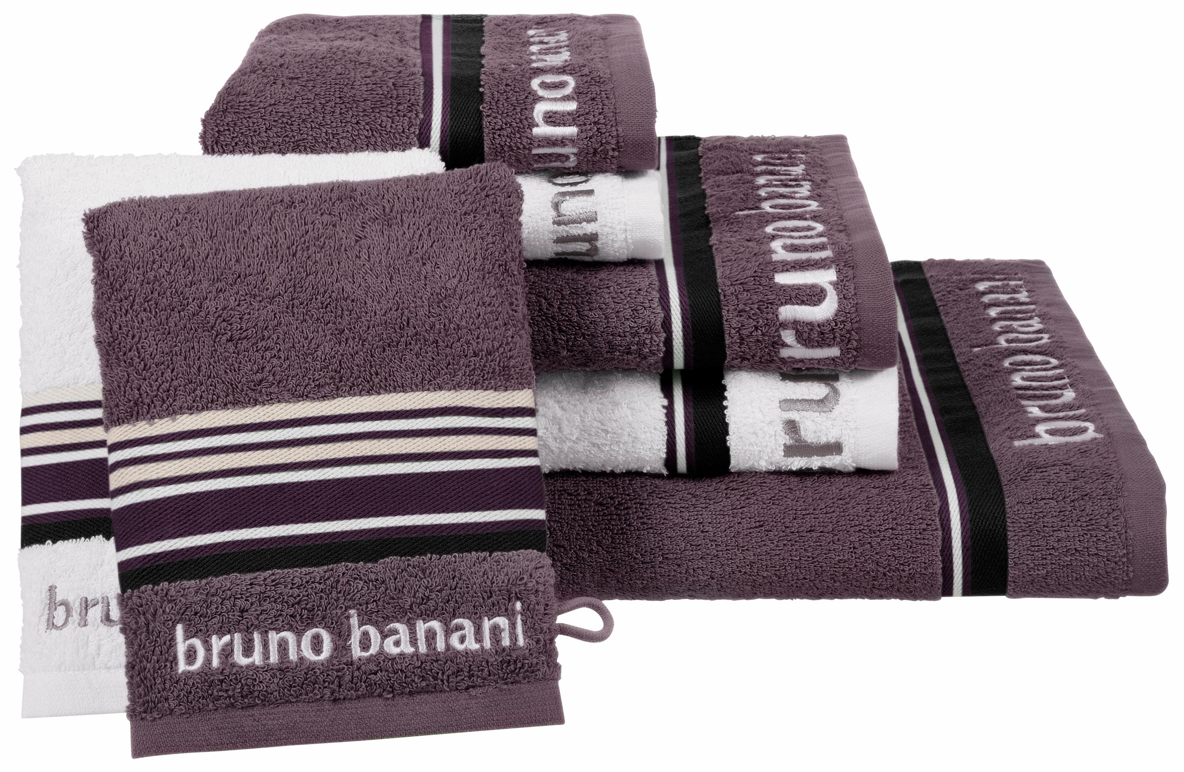 Bruno Banani Handtuch Set »Maja, 1 Duschtuch, 2 Handtücher, 2 Gästehandtücher, 2 Waschhandschuhe« Set 7 Walkfrottee mit Bordüre und Markenlogo, 7 teiliges Handtücher Set, 100% Baumwolle