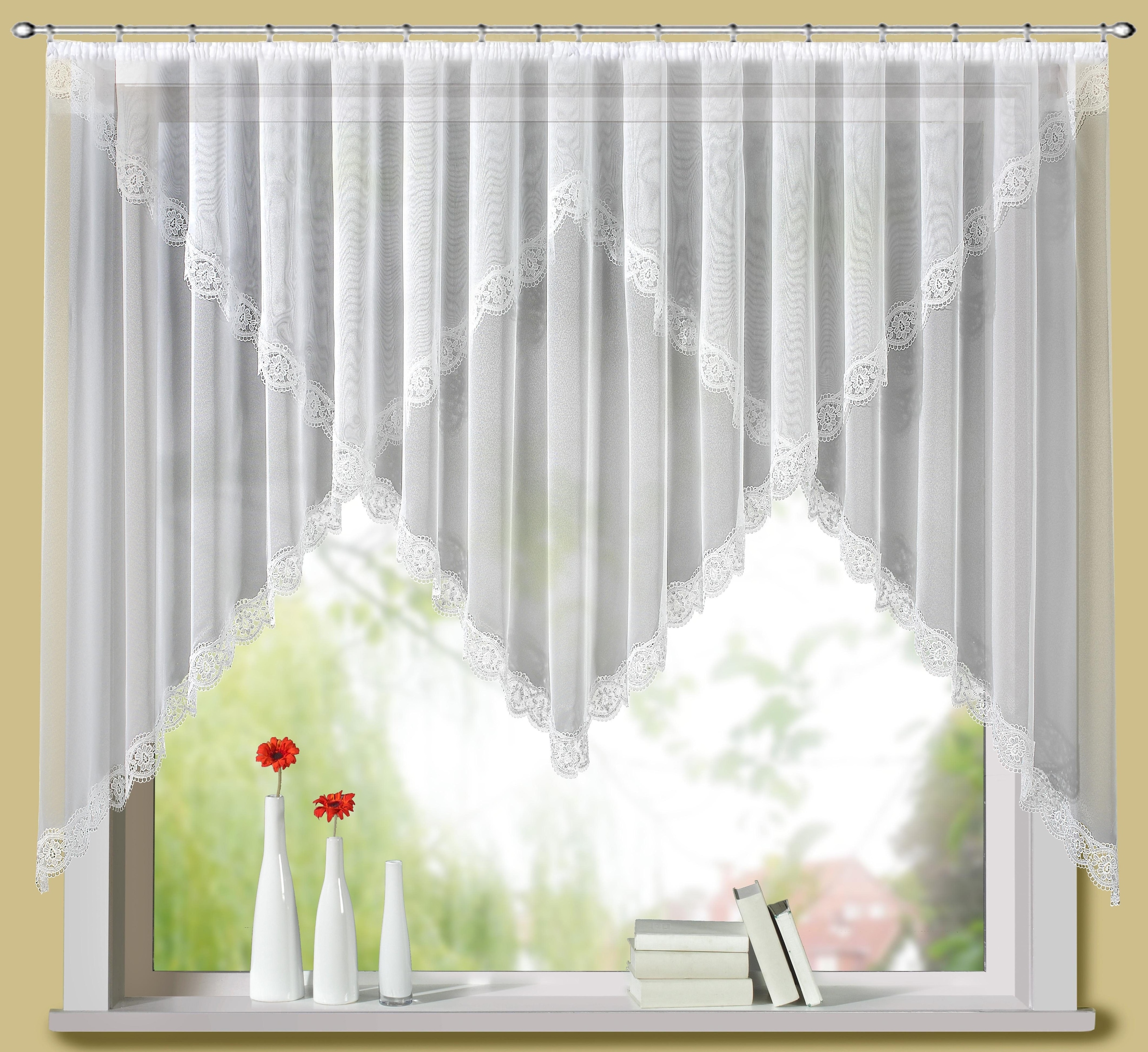 Wunderschöner >Kuvertstores aus dem Hause Stickereien und Textilien Plauen mit echter Plauener Spitze verarbeitet. Sie entscheiden sich hier für einen hochwertigen und eleganten Store, der Ihre Fenster verzaubern wird. Material 100 % Polyeser, sehr pflegeleicht. Oben mit Universalschienenband, einfache Montage.
