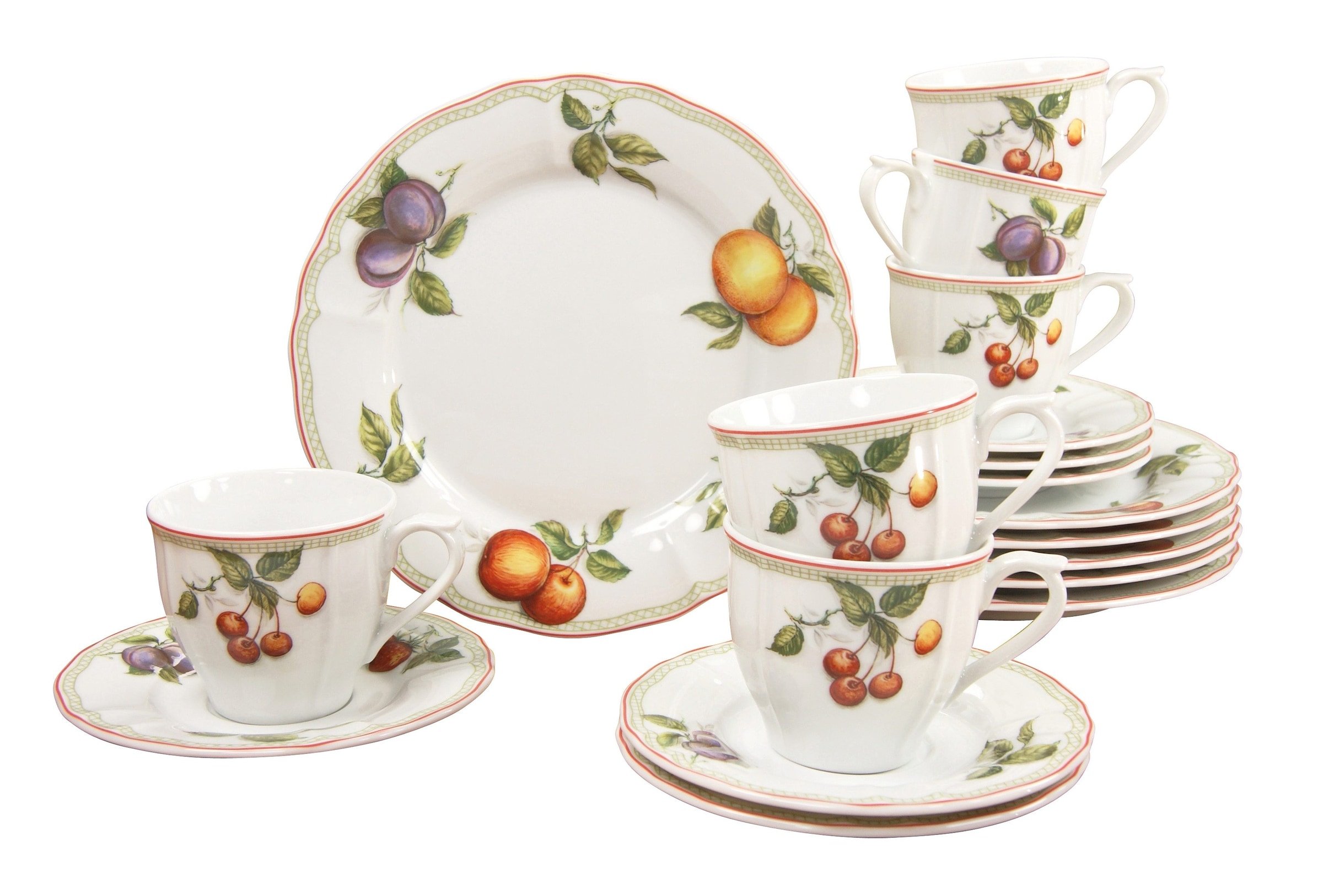 Kaffeeservice, 18-teilig, »Flora Orchard«, CreaTable. Mit Landhaus Früchte Dekor auf einer Porzellanform in nostalgischem Manufakturstil. Das tolle Obstdekor kombiniert mit einer Karogitterkante schmiegt sich perfekt an die runde Form. Ein verspieltes Geschirr, an dem Sie lange Freude haben werden. Spülmaschinenfest und mikrowellengeeignet. Kaffeeservice 18-teilig: je 6 Tassen 20 cl, Untertassen 14,5 cm, Dessertteller 21 cm.