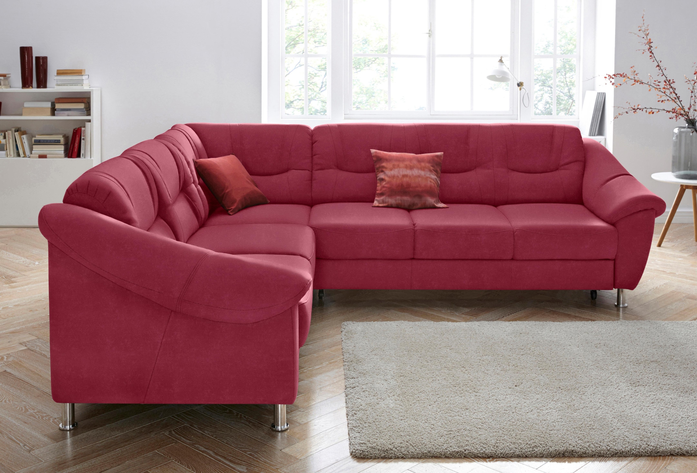 Zum sehenswerten Blickfang wird die wahlweise mit Bettfunktion erhältliche Polsterecke von Sit&More durch die tolle Formsprache mit gekonnt gesetzten Steppungen. Unterstützt wird das Design durch die großzügigen, gerundeten Armlehnen und den schicken Bezugsstoff. Das Ecksofa bietet sich für die unterschiedlichsten Wohnstile an. Besonders harmonisch lässt es sich zur modernen Einrichtung kombinieren. Flexibel kann zwischen verschiedenen Bezugsqualitäten gewählt werden und der lange Schenkel für links oder rechts bestellt werden. Das Sofa mit Gestell aus FSC®-zertifiziertem Holzwerkstoff stellt mit dem Federkern, der Wellenunterfederung und der atmungsaktiven Polsterung optimalen Sitz- und Liegekomfort zur Verfügung. Der Mittelpunkt für gemütliche Stunden zu Hause, ob mit Gästen, der Familie oder allein, ist die wahlweise mit Bettfunktion erhältliche Sit&More Polsterecke.