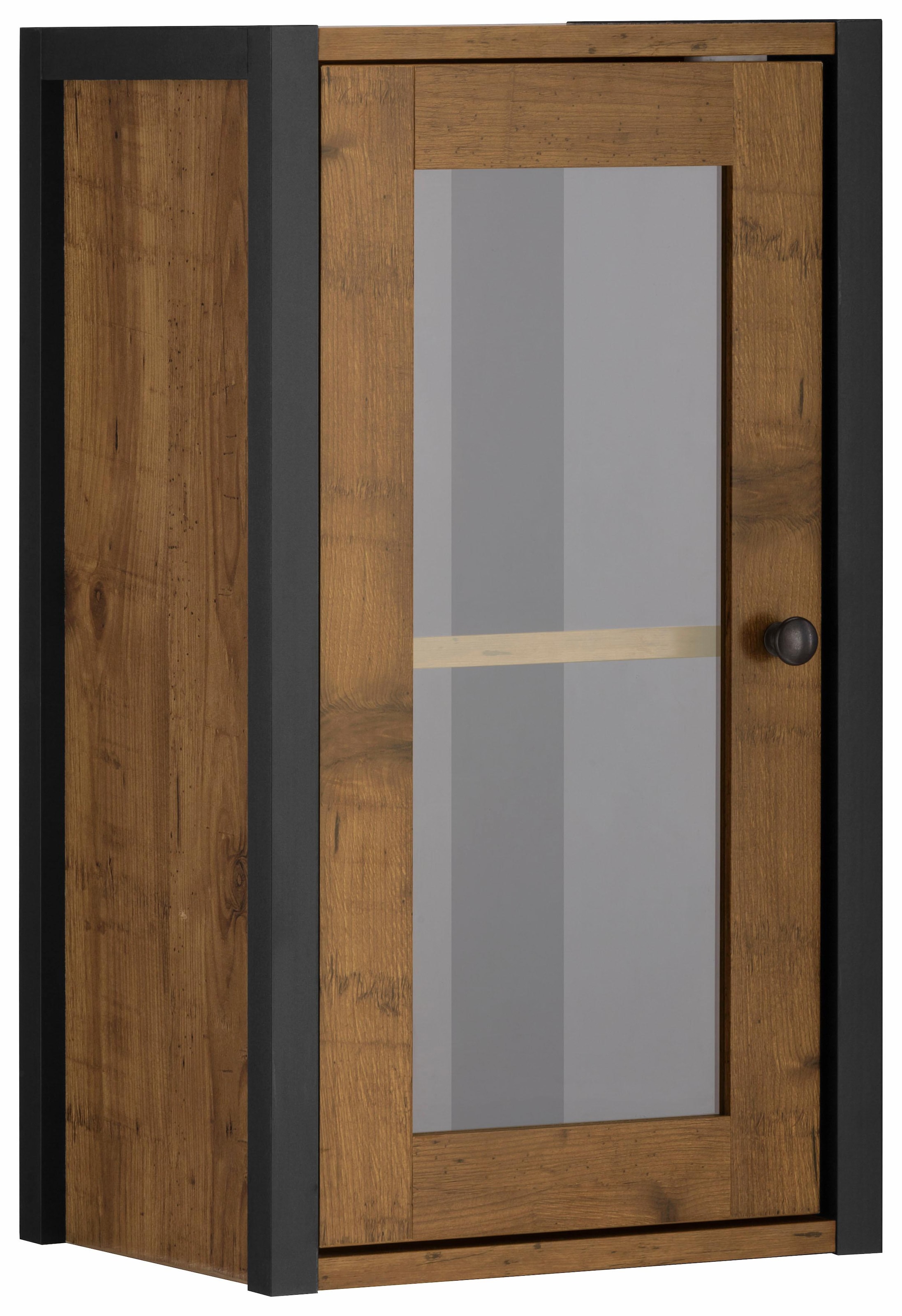 Die rustikale Optik macht den modernen Hängeschrank »Chris« von Home affaire zur dekorativen Bereicherung für das Badezimmer oder den Wohnbereich. Er präsentiert sich in geschmackvoller Optik und Farbkombination. Besonders sehenswert wird das Gesamtbild durch den MDF-Rahmen in Metalloptik. Zudem befindet sich in der Tür ein Glaseinsatz, der den Blick auf den Innenraum freigibt. An der Tür befindet sich als Griff ein klassischer Metallknauf. Der Schrank stellt ein geräumiges Hauptfach zur Verfügung. Ausgestattet ist der Innenraum mit einem höhenverstellbaren Einlegeboden, der sich ganz auf die individuellen Anforderungen ausrichten lässt. Bei der Fertigung kommt FSC®-zertifizierter Holzwerkstoff zum Einsatz.